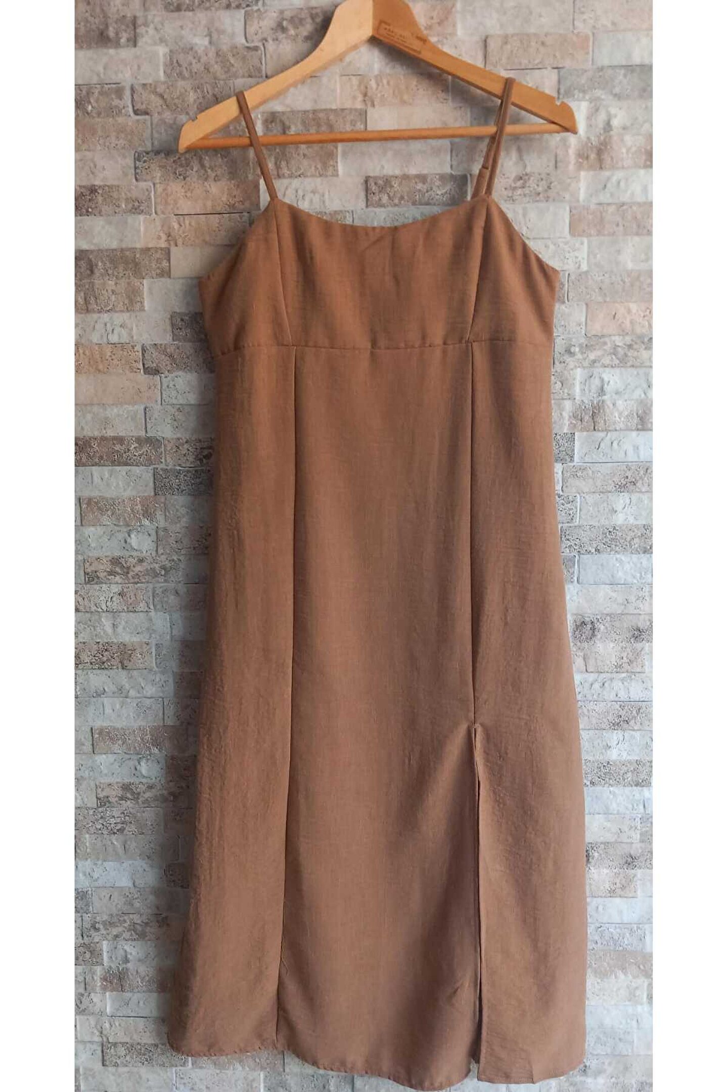 Günlük kullanıma uygun, rahat ve şık tasarımıyla dikkat çeken ip askılı yandan fermuarlı kahverengi elbise.; Omzu açık silueti ile modern ve feminen bir görünüm sunar.; Fileto cepleri sayesinde pratiklik ve fonksiyonellik kazandırılır.; İnce yapısı ile hafif ve konforlu bir kullanım sağlar.; Midi boyu, hem günlük hem de özel etkinlikler için ideal bir uzunluktur.; Kare yaka detayı ile boynunuzu zarifçe çerçeveleyerek sofistike bir hava katmaktadır.; Fermuar kapama şekli, giyip çıkarmayı kolaylaştırırken şık bir detay olarak öne çıkar.; Viskon süprem dokuma tipi, yumuşak dokusuyla teninize nazikçe dokunur.; Düz deseni sayesinde zamansız bir tarzı temsil eder; her tür aksesuarla kombinlenebilir.; İç göstermeyen yapısıyla güvenle hareket etme özgürlüğü sunar.; Modest koleksiyonun parçası olarak genç ve tüm yaş gruplarına hitap eden tarza sahiptir.; Tüm yaş gruplarının ihtiyaçlarına cevap verecek şekilde geniş bir kullanıcı kitlesine sahiptir.; Kısa programda yıkama talimatına uygun olarak kolayca bakım yapılabilir.; Örme kumaş tipi esnekliği arttırarak vücut hatlarınıza mükemmel uyum sağlar.; Dar kalıbı sayesinde vücut hatlarınızı nazikçe sararken feminen siluetinizi ön plana çıkartır.;