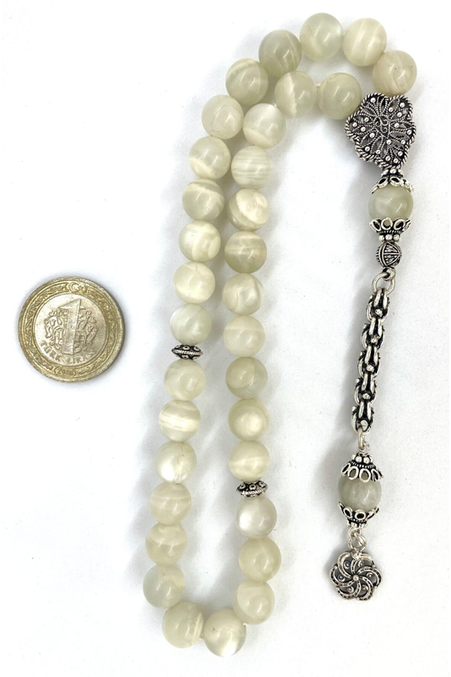 Gümüş kaplama malzemesiyle üretilmiş, uzun ömürlü ve şık bir görünüm sunar; Doğal aytaşı taşı, her bir tesbih tanesi benzersiz desen ve renklerle süslenmiştir, bu da her kullanımda farklı bir deneyim sağlar; Geleneksel el işçiliği ile üretilmiş olup, hem estetik hem de kalite açısından öne çıkar;