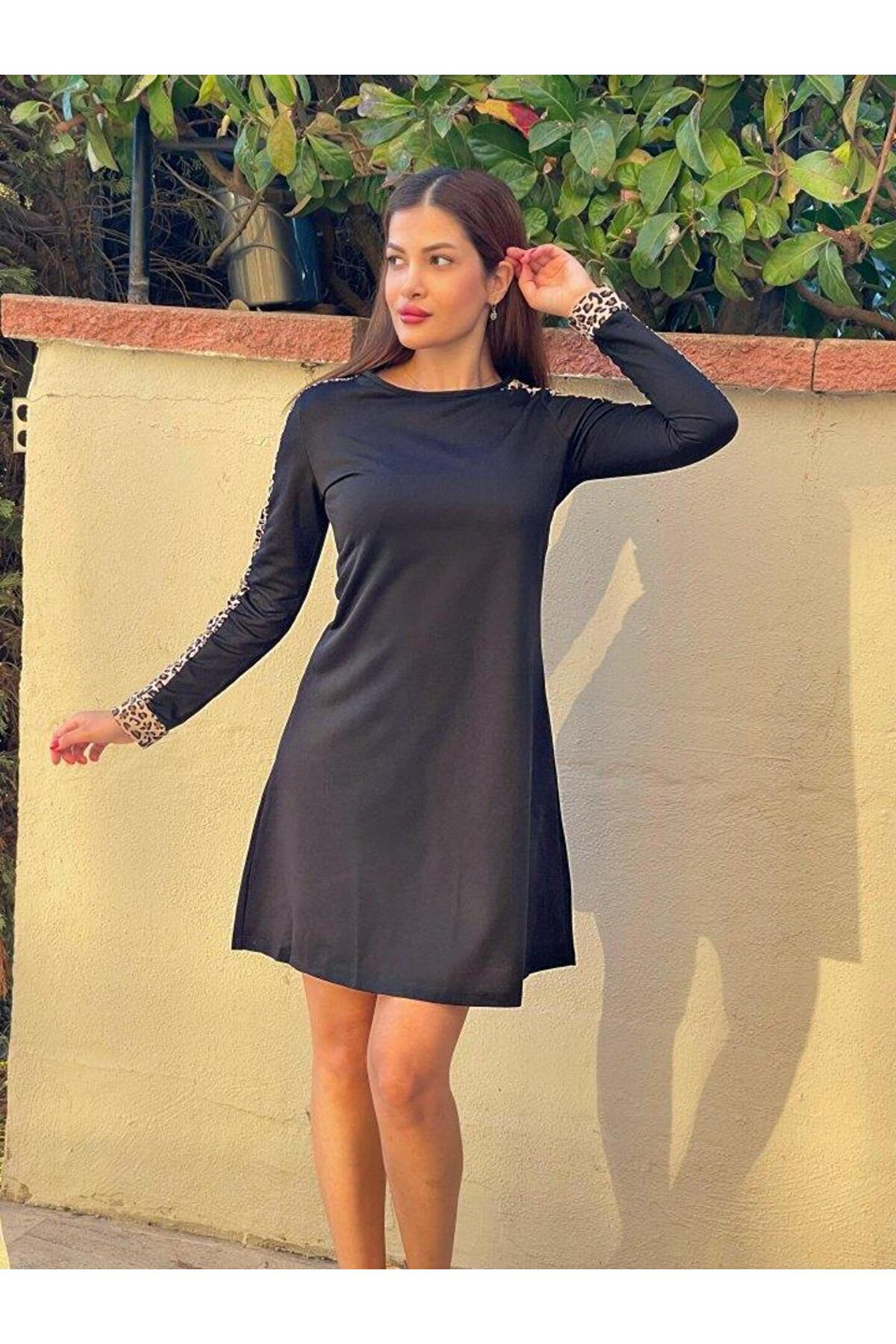 Kadın Uzun Kollu Bisiklet Yaka Kollar Leopar Detay Iki Iplik Mini Boy Elbise