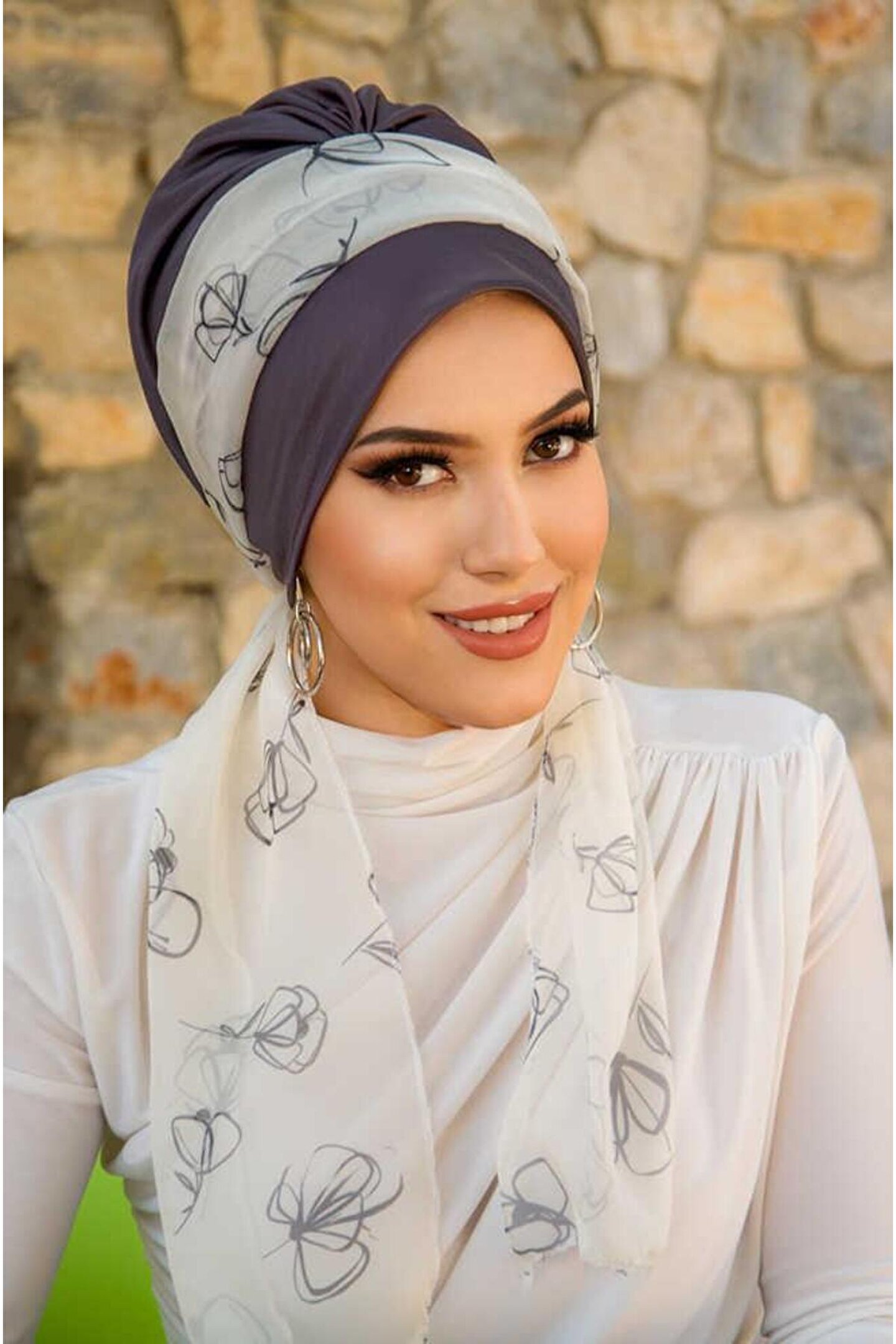 Aişe tesettür Antrasit Beyaz Çiçek Desen Fularlı Bone