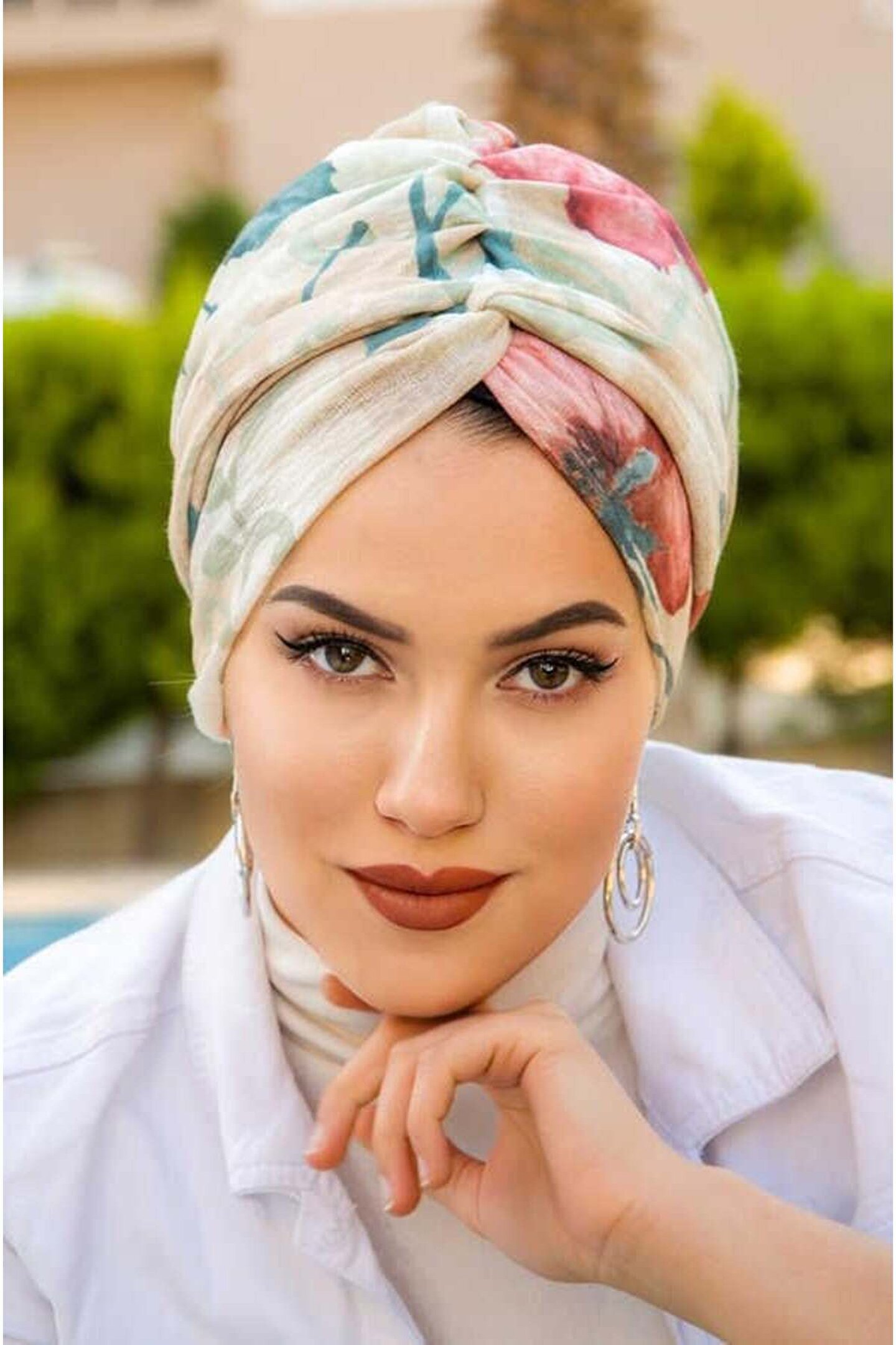 Beyaz Mavi Desenli Büzgülü Salaş Bone