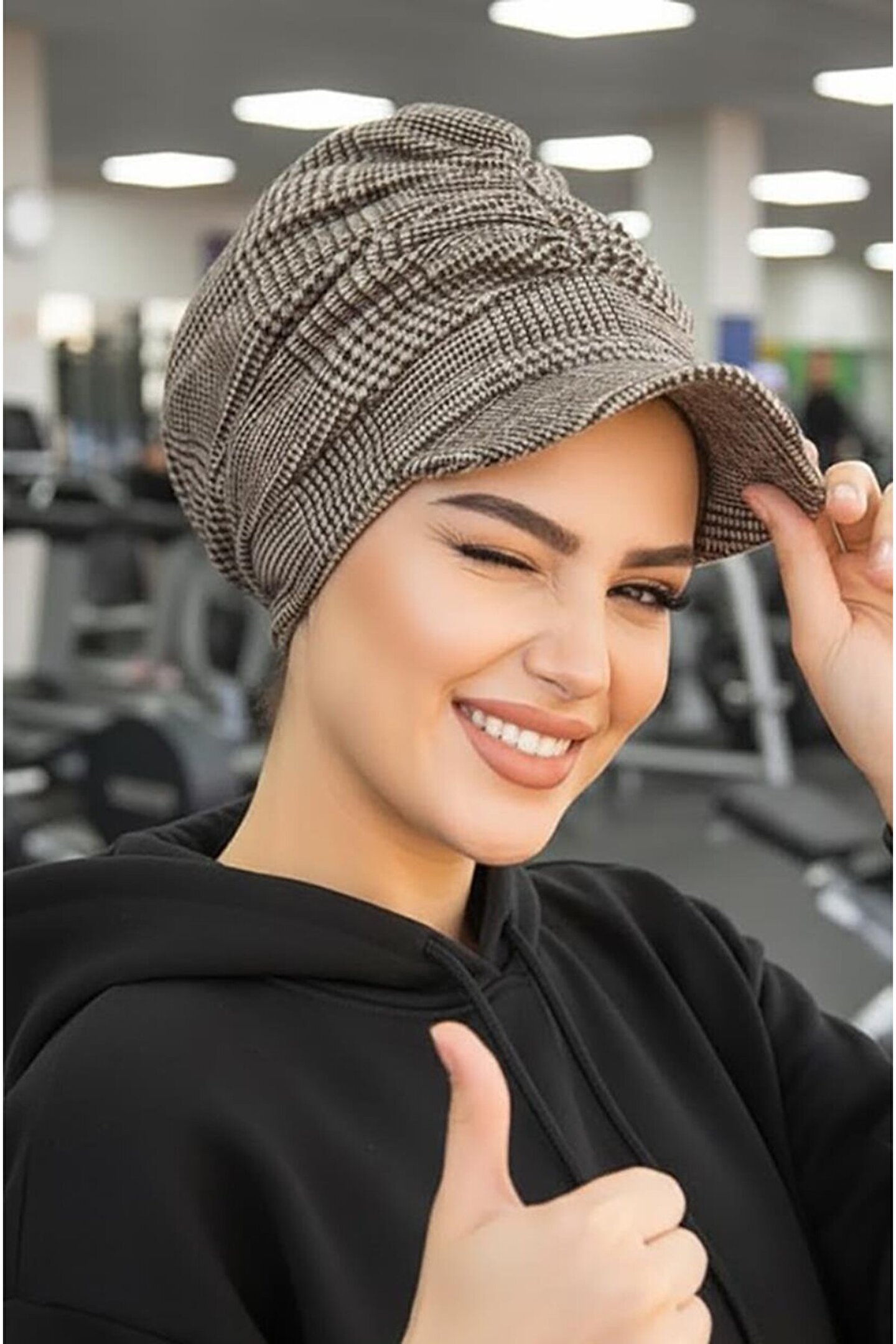Aişe tesettür Bej Siyah Ekose Tesettür Şapka