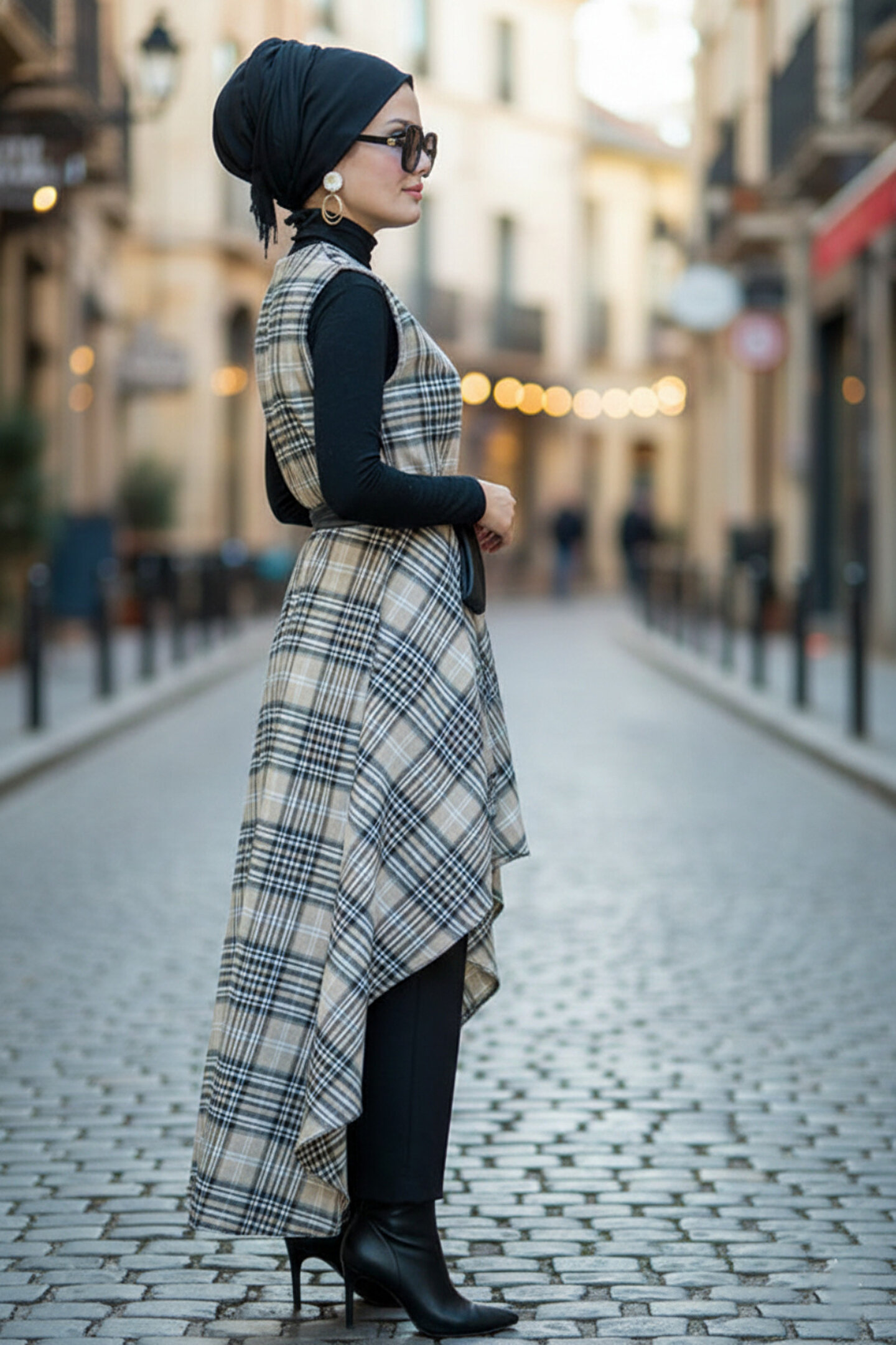 Aişe tesettür Bej Siyah Ekoseli Yelek