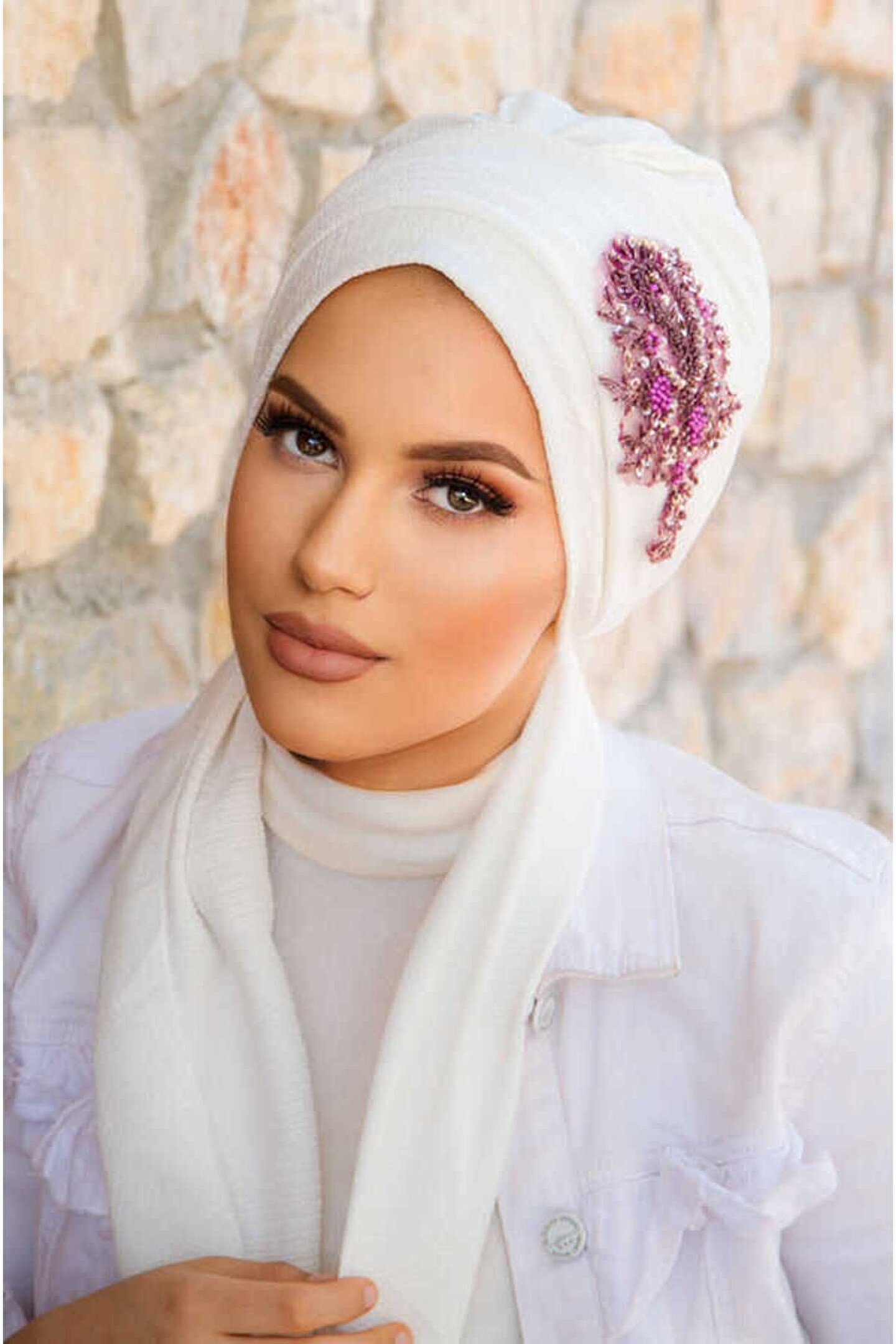 Beyaz Mürdüm Nakışlı Atkılı Abiye Bone - 60101