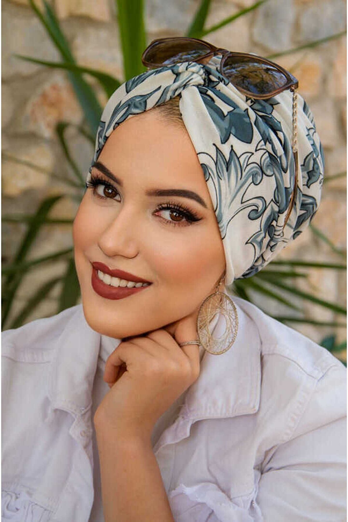 Beyaz Mavi Desenli Büzgülü Salaş Bone
