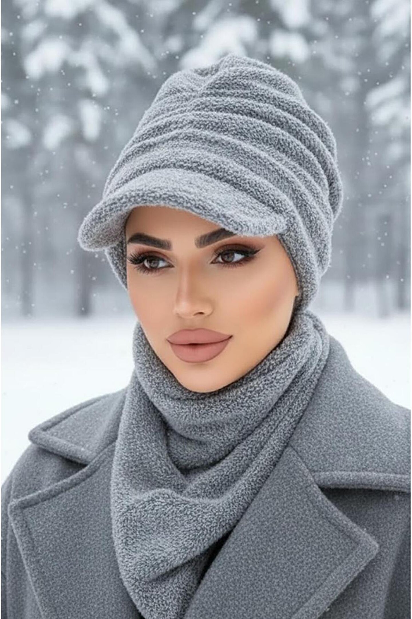 Aişe tesettür Gri Kürk Şapka ve Etol Takım
