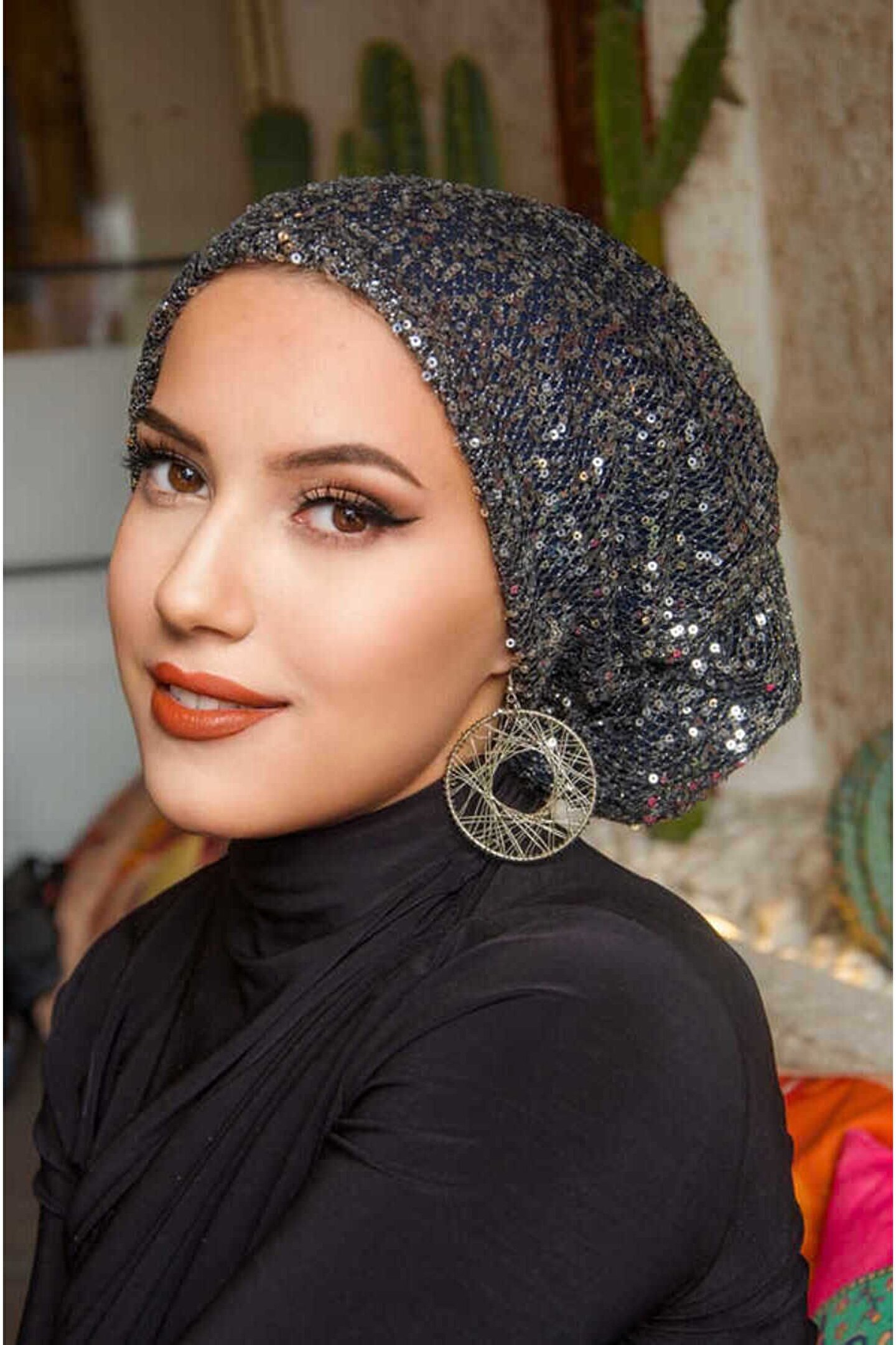 Gümüş Lacivert Payetli Çağla Abiye Hazır Türban Bone