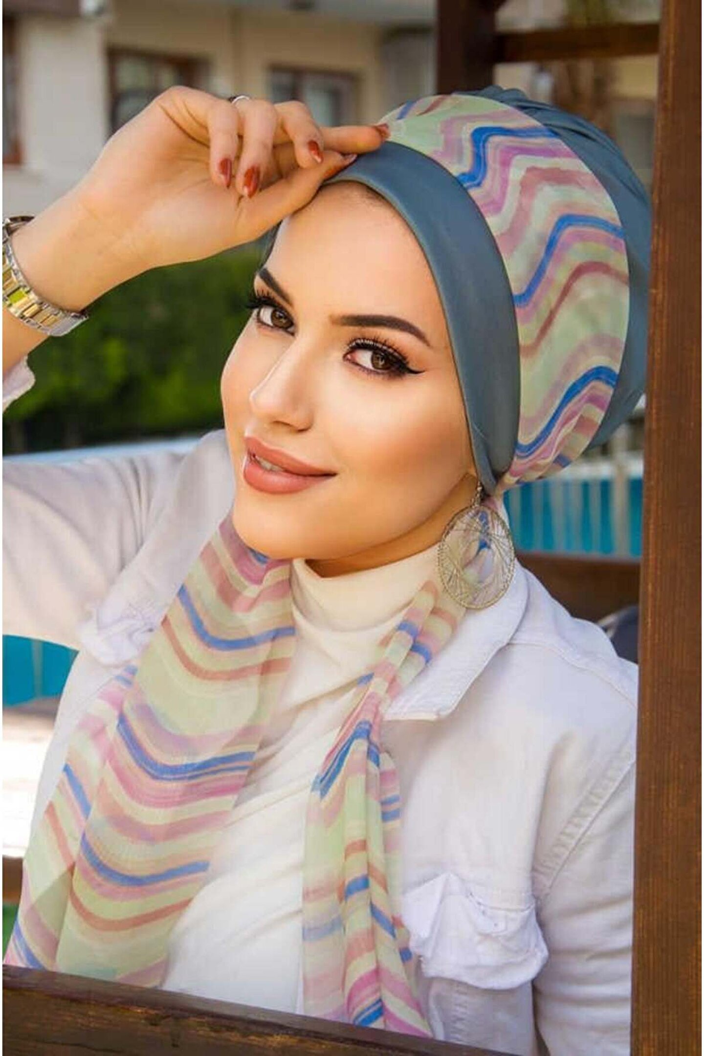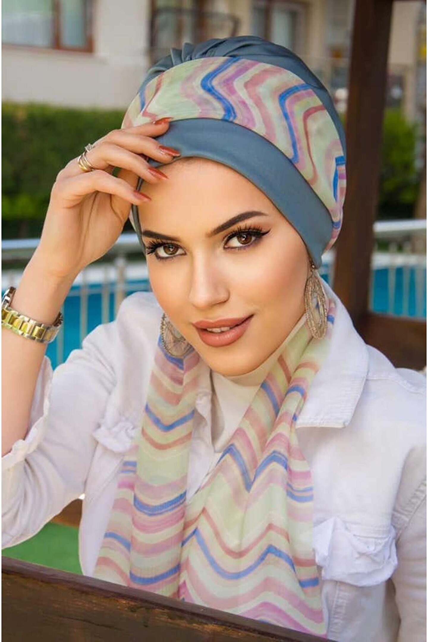 Aişe tesettür İndigo Geometrik Desen Fularlı Bone