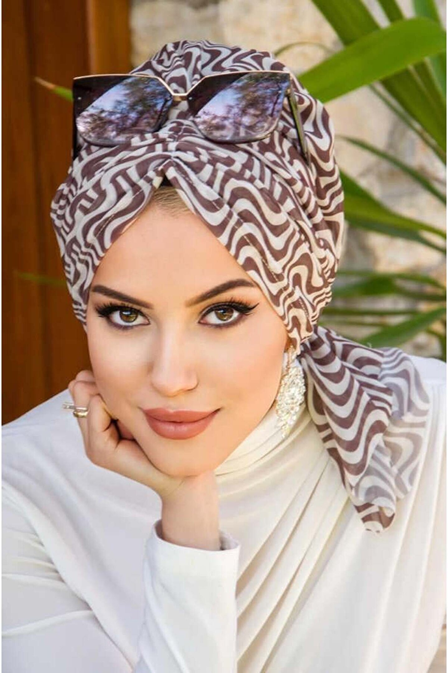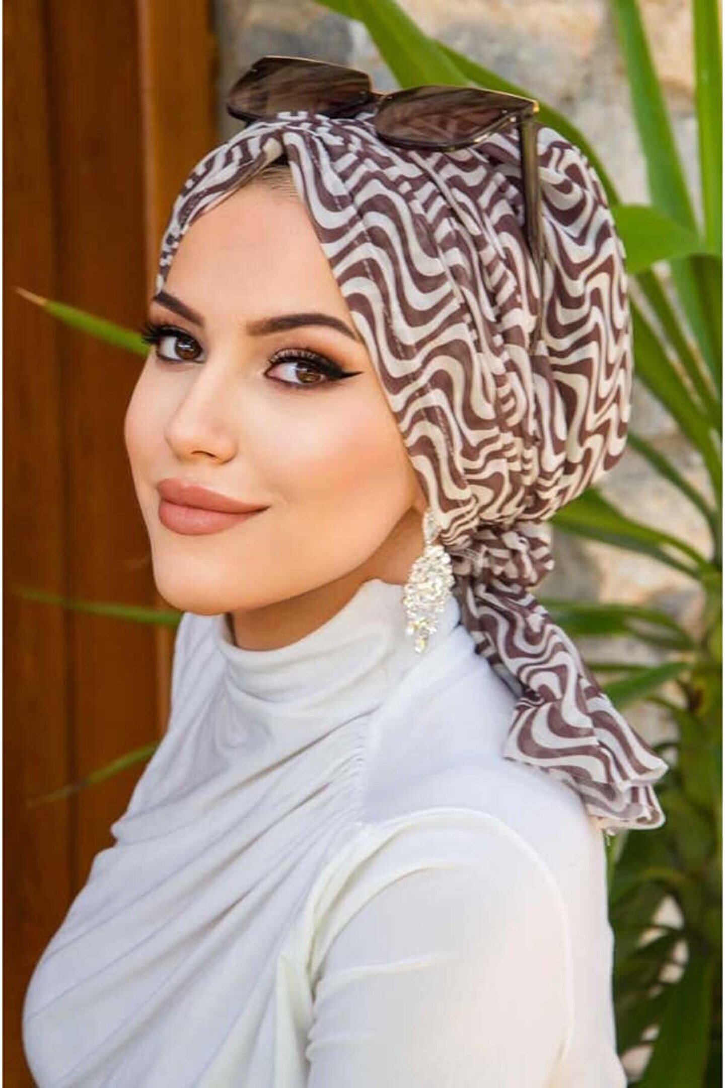Aişe tesettür Kahve Helezon Desen Tül Tokalı Bone