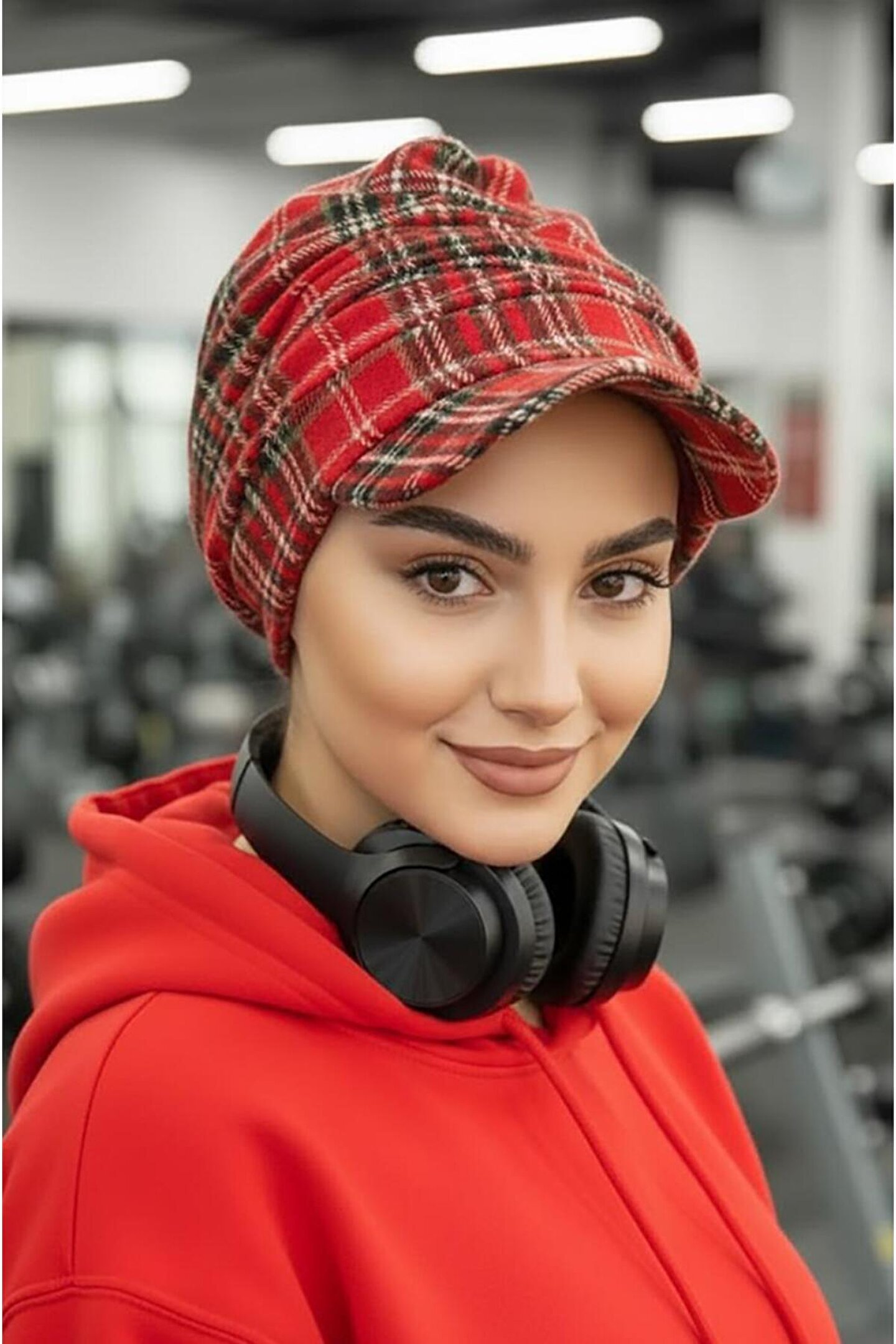 Aişe tesettür Kırmızı Ekose Desen Tesettür Şapka
