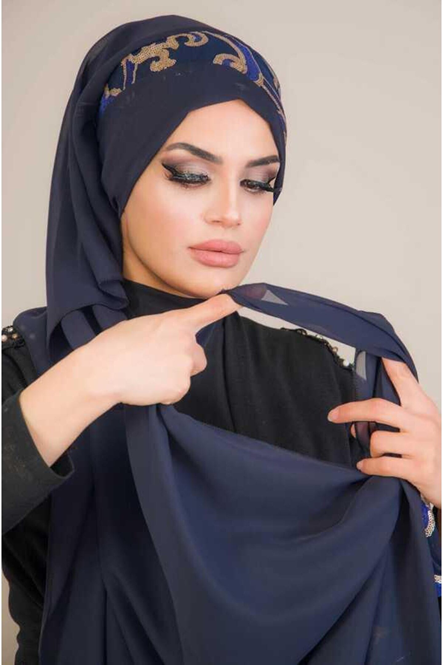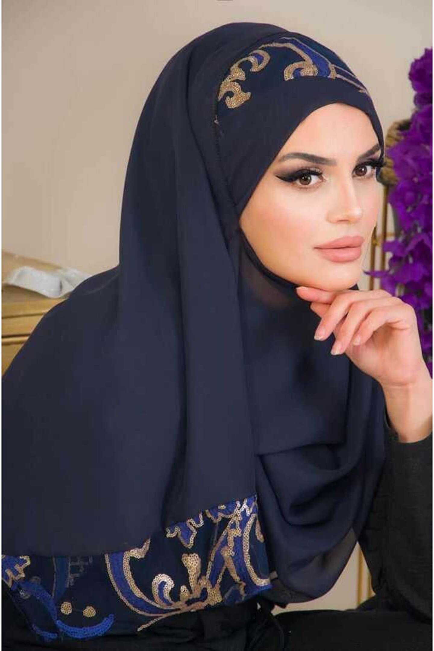 Lacivert Payetli Abiye Double Şal Kumaş Cinsi : Fransız Şifon Ürün Özelliği : Çift kat oluşu ile iç göstermez esnek formuyla başınızı sarar rahat kullanım özgürlüğü sunar; İade ve değişim : 15 gün içinde koşulsuz iade ve değişim Teslimat Tarihi : Türkiye içi 2; 4 iş günü / Avrupa; Amerika 4; 7 iş günü;