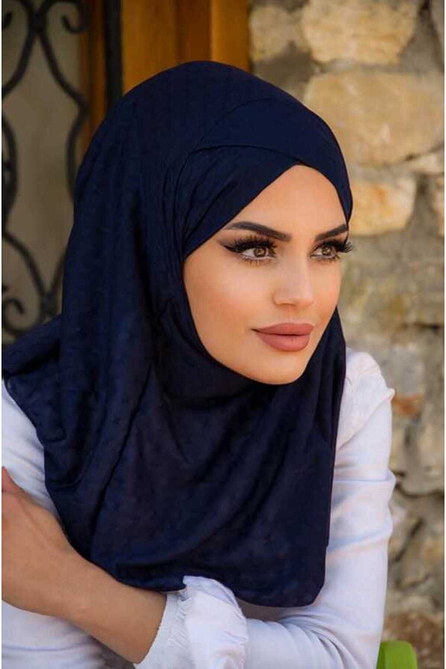 Lacivert Ponpon Çapraz Bantlı Medium Size Hijab - Hazır Şal