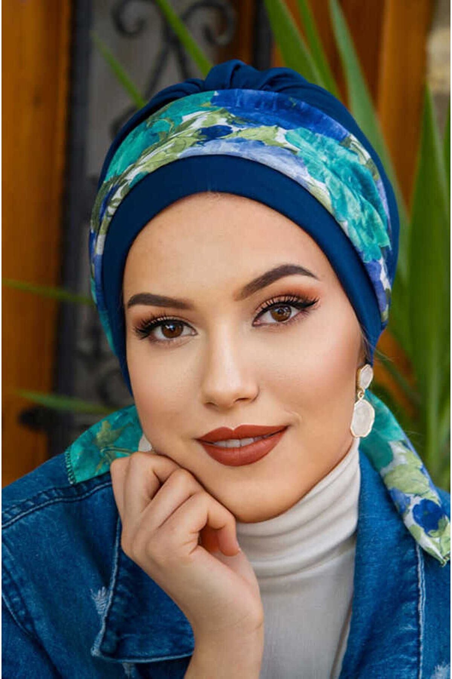 Lacivert Turkuaz Çiçek Desen Bantlı Bone