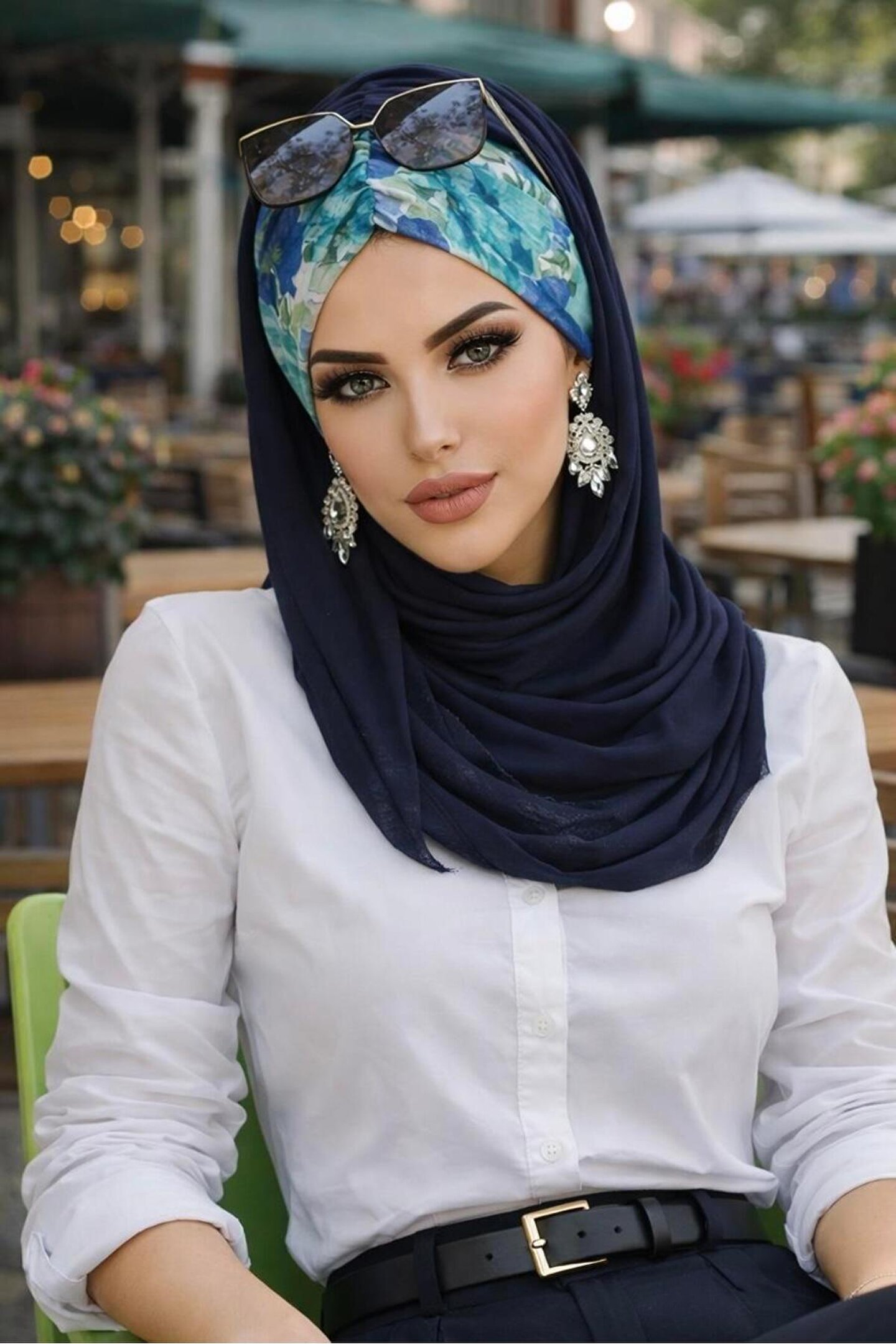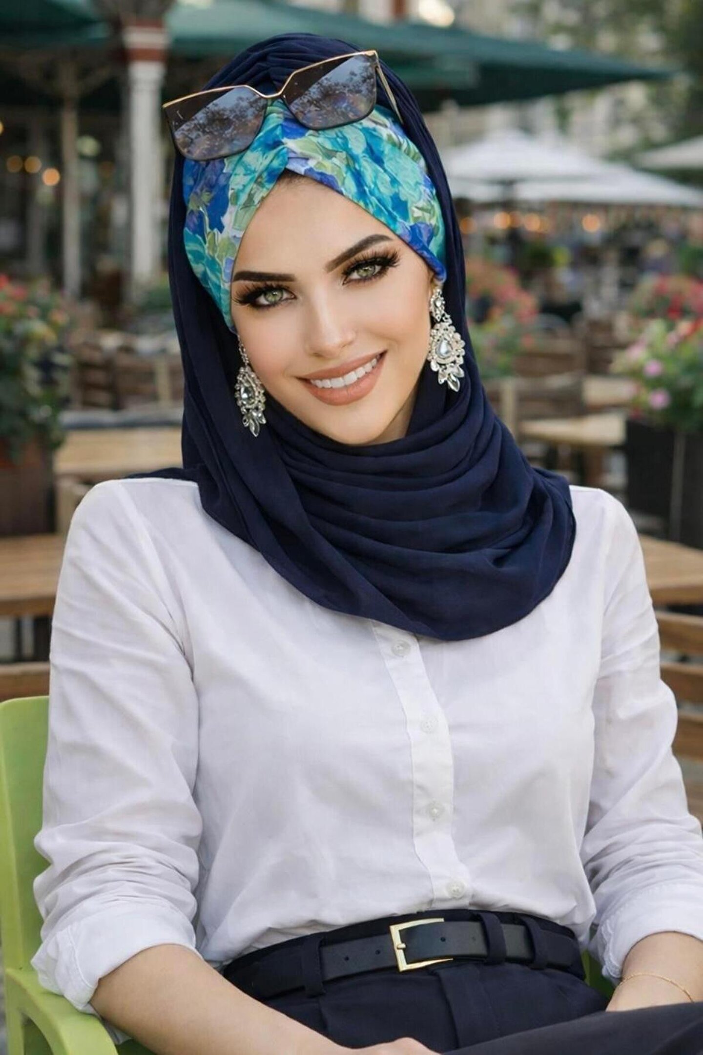 Aişe tesettür Lacivert Turkuaz Çiçek Desen Hazır Şal