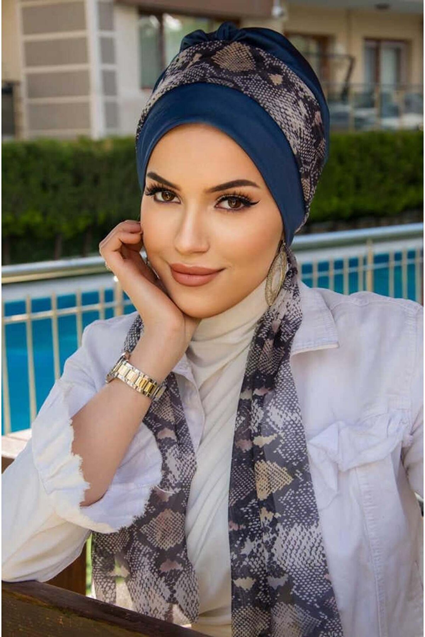 Aişe tesettür Lacivert Yılan Derisi Desen Fularlı Bone