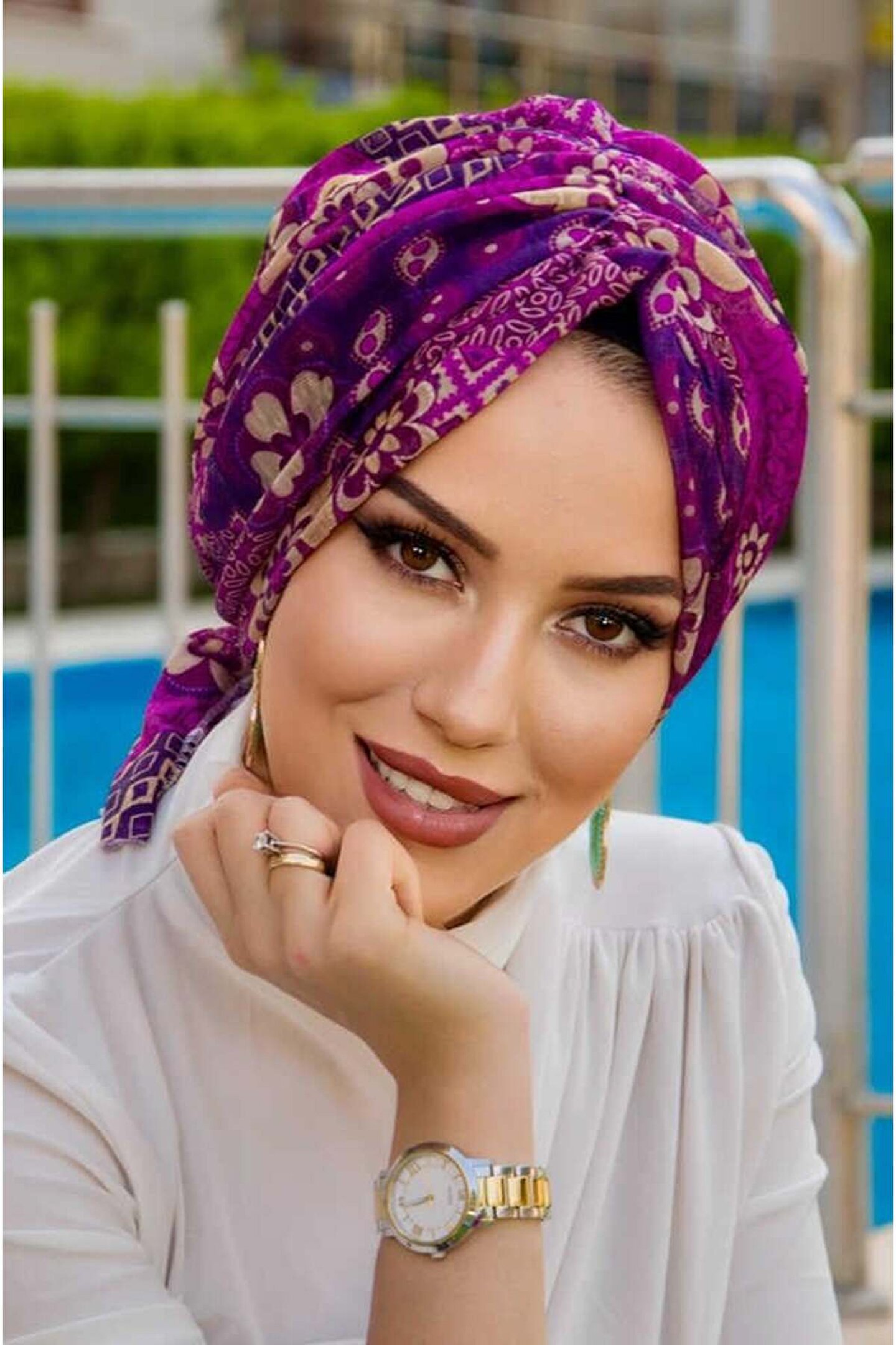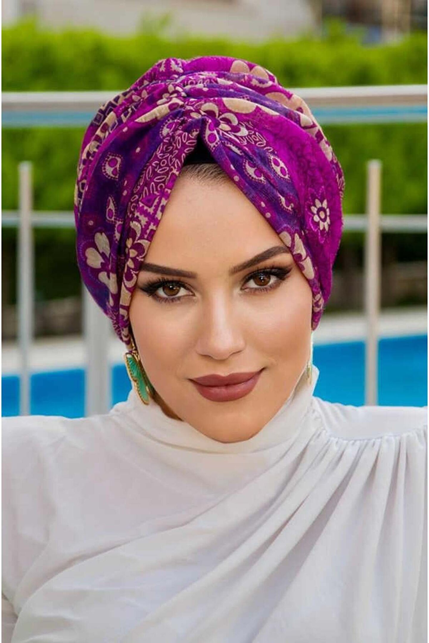 Aişe tesettür Mürdüm Bej Çiçek Desen Tokalı Bone