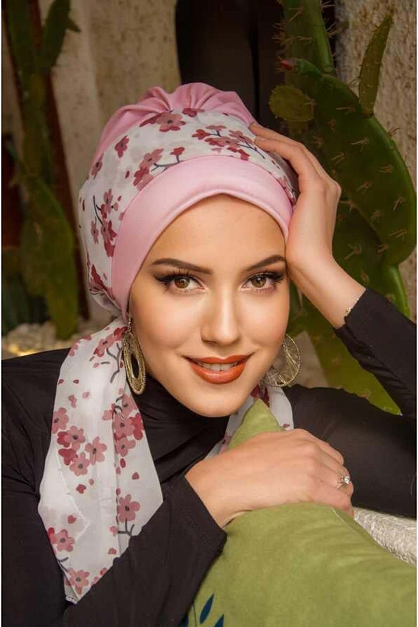 Aişe tesettür Pudra Çiçek Desen Fularlı Bone