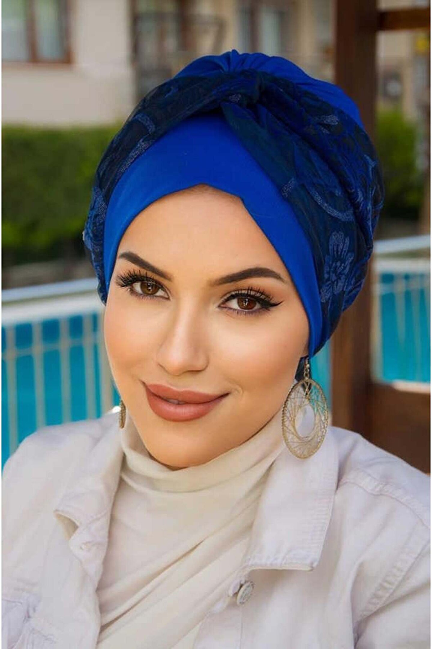 Aişe tesettür Saks Mavi Çiçek Desen Burgu Bantlı Bone