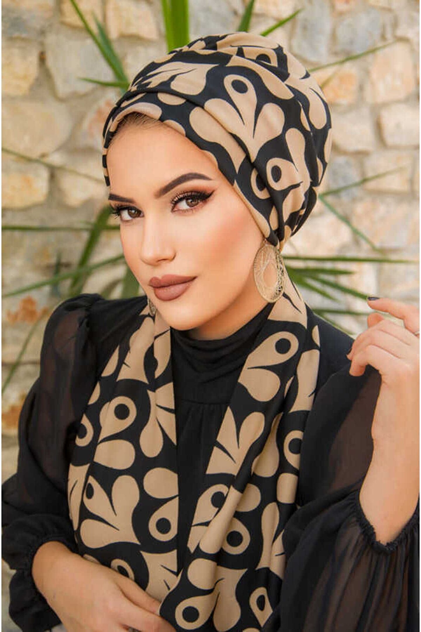 Siyah Bej Yaprak Desenli Atkılı Bone