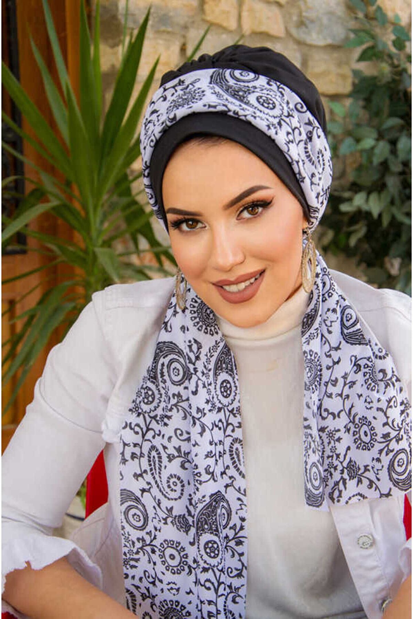 Siyah Beyaz Etnik Desen Fularlı Bone