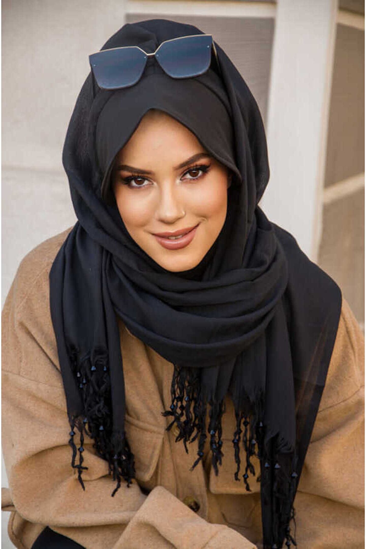 Siyah Boncuklu Koton Şapkalı Şal - 50800