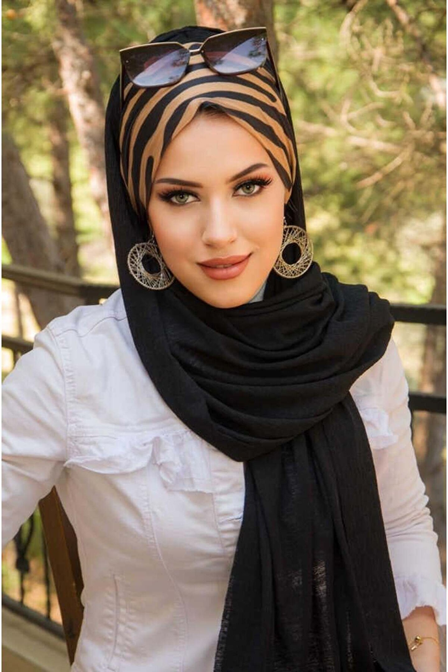 Aişe tesettür Siyah Gold Zebra Desen Bone Hazır Şal
