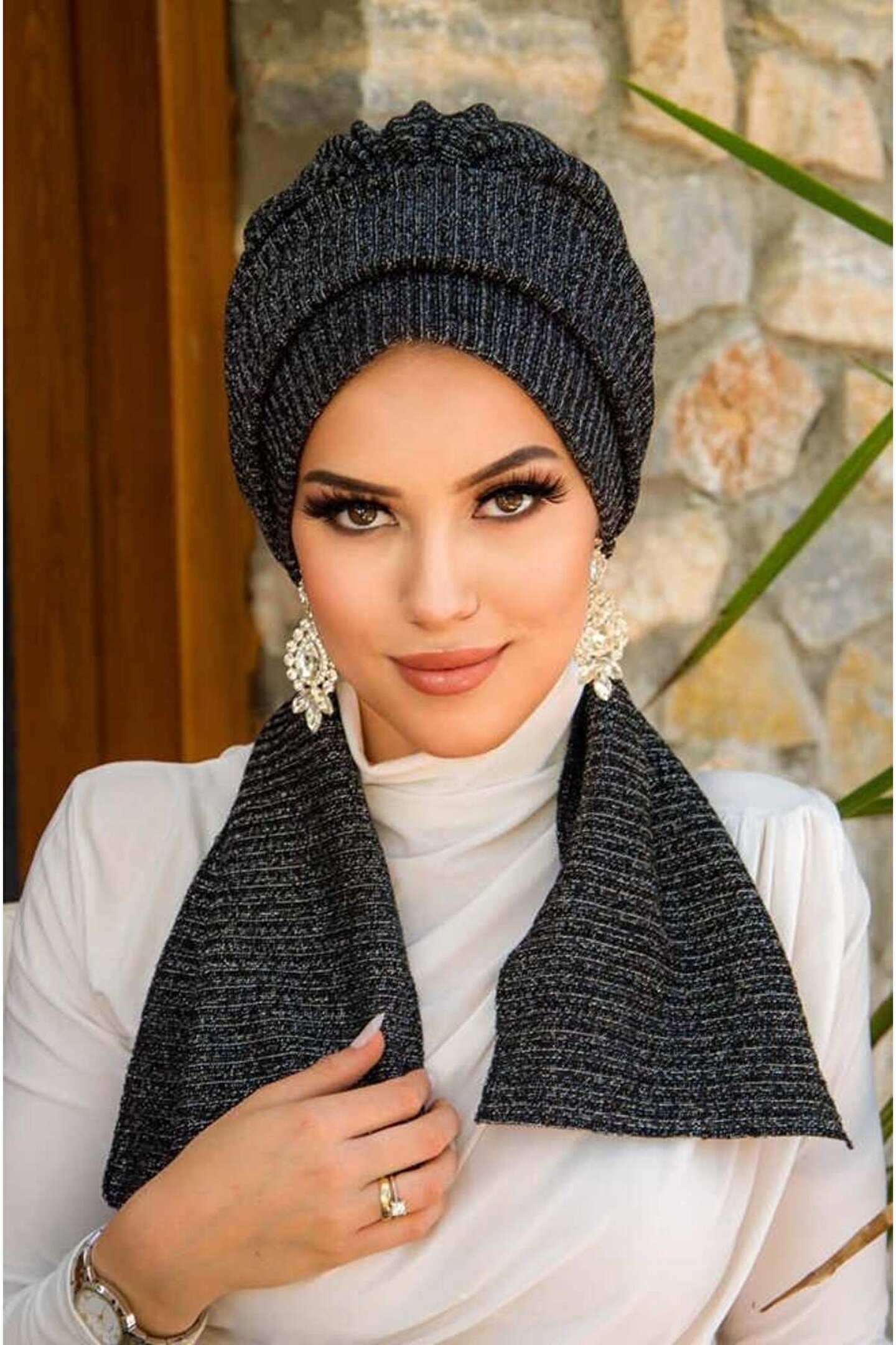 Aişe tesettür Siyah Gümüş Fitilli Atkılı Tesettür Bone