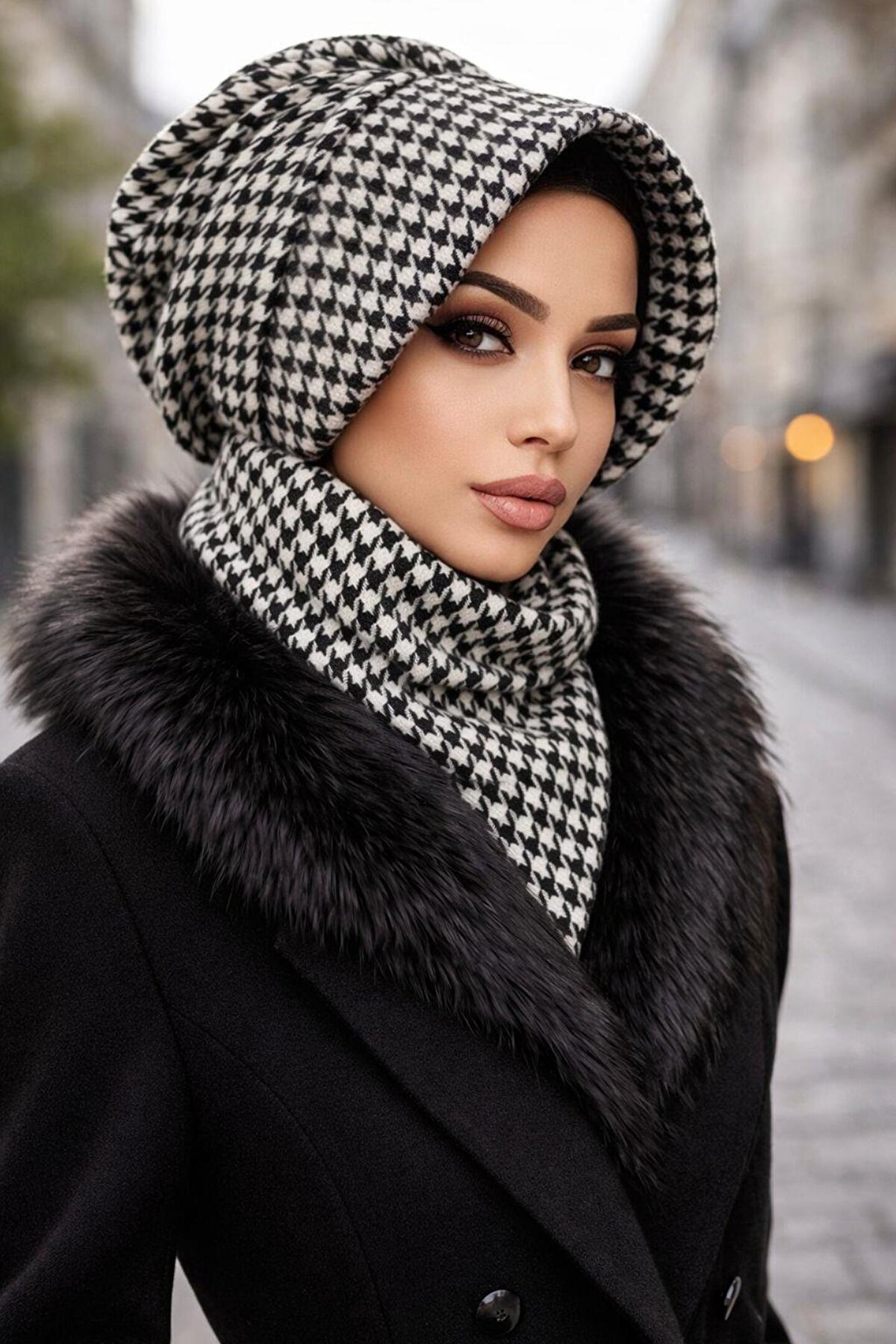 Aişe tesettür Siyah Kazayağı Kaşe Şapkalı Bone Ve Etol Takım