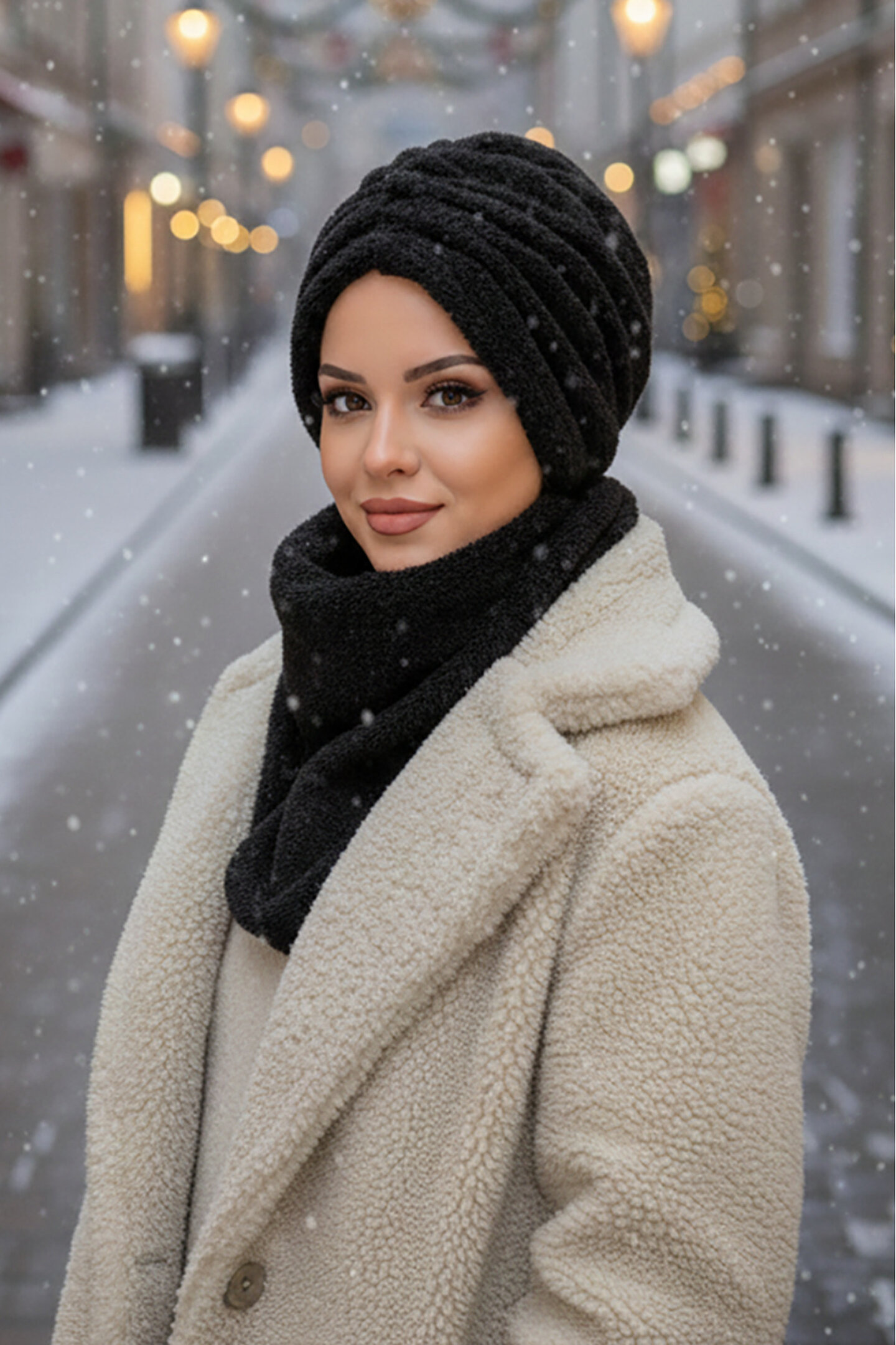 Aişe tesettür Siyah Kürk Büzgülü Bone Ve Etol Takım