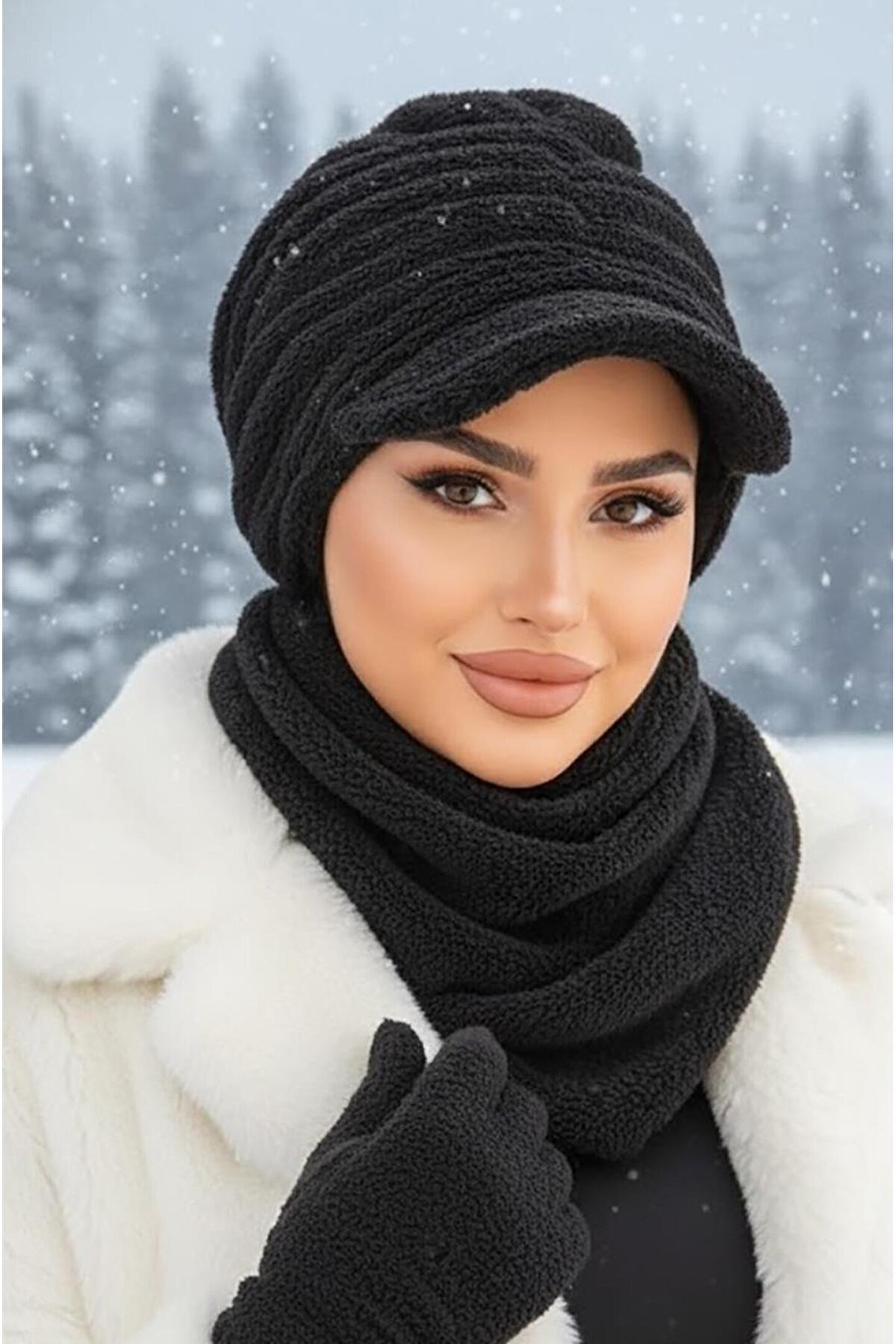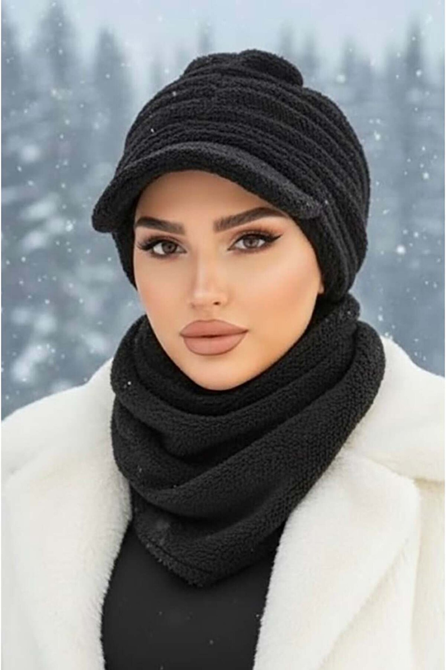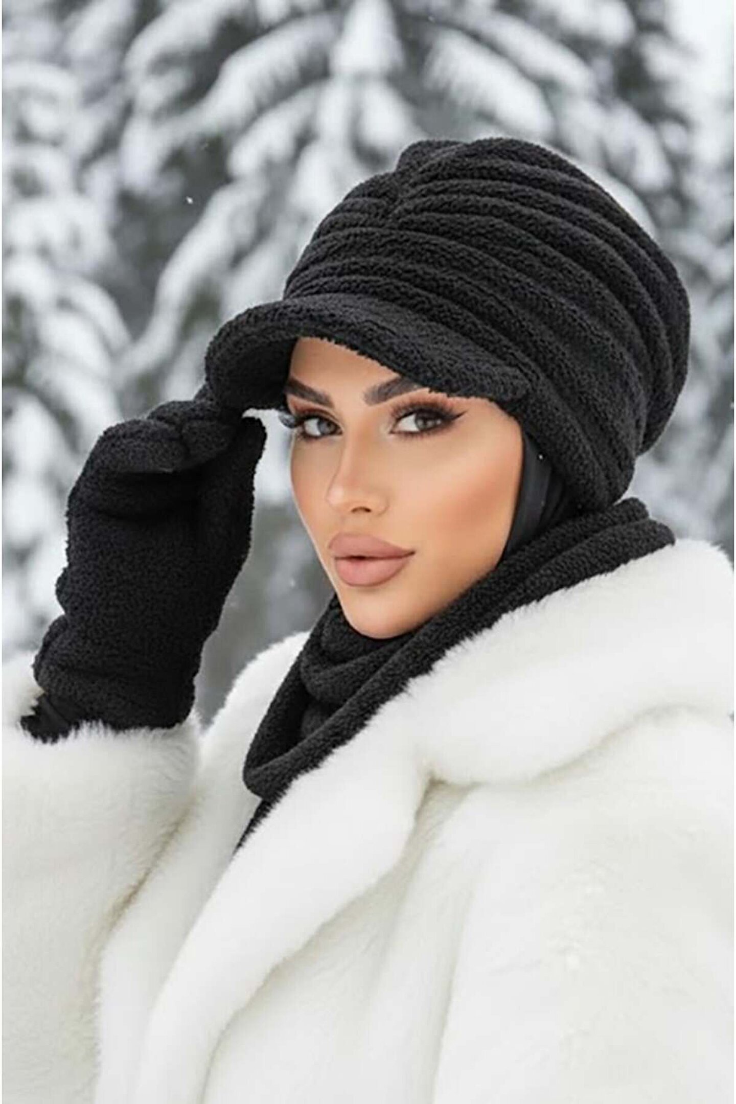 Aişe tesettür Siyah Kürk Şapka ve Etol Takım