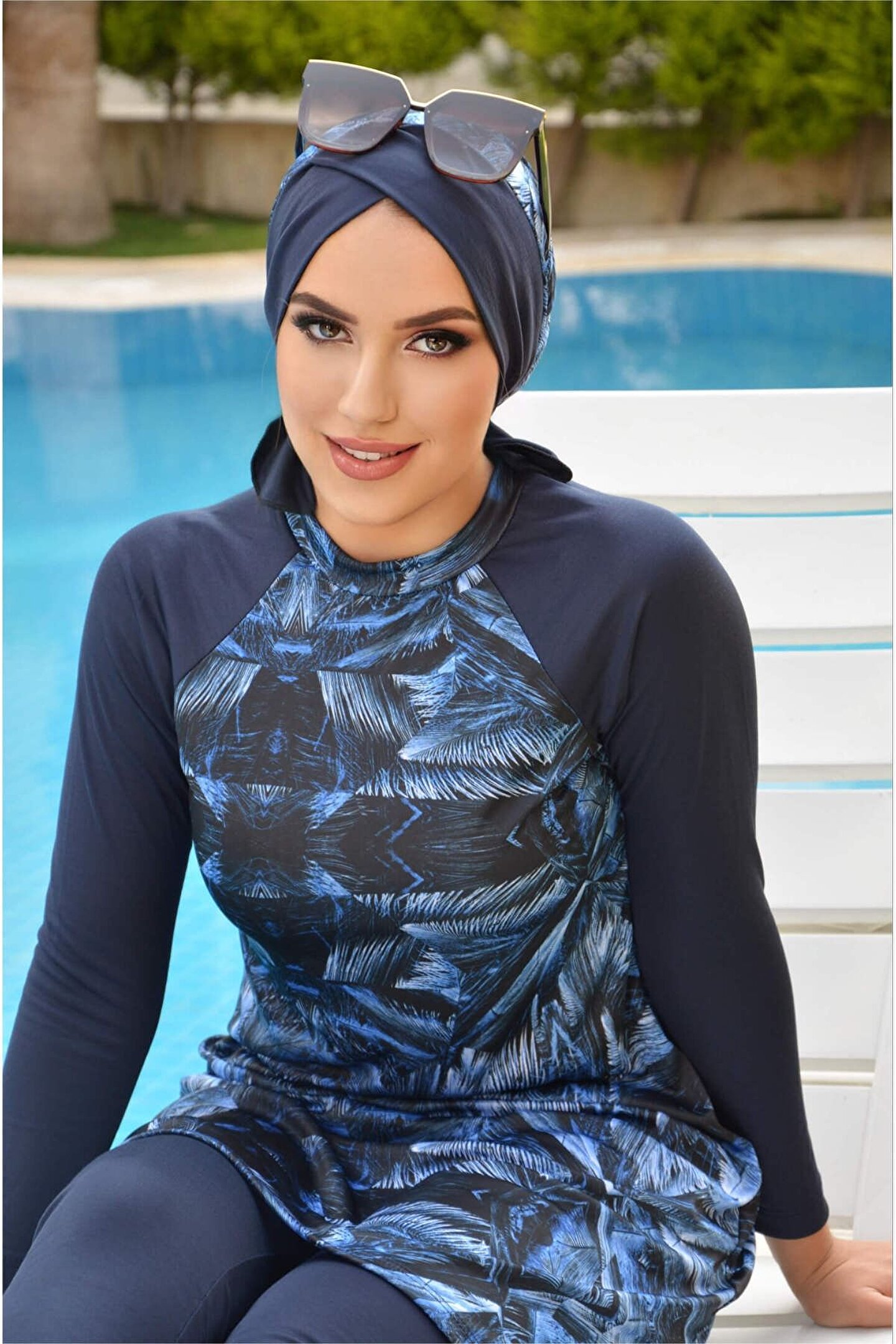 Lacivert Turkuaz Desenli Tesettür Mayo Takım
