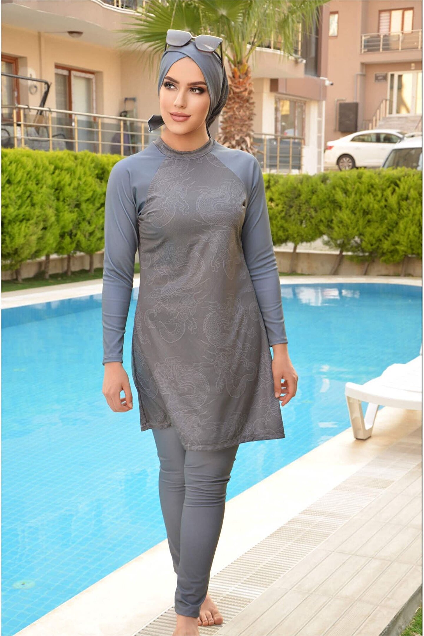 Aişe tesettür Füme Siyah Desenli Tesettür Mayo Takım