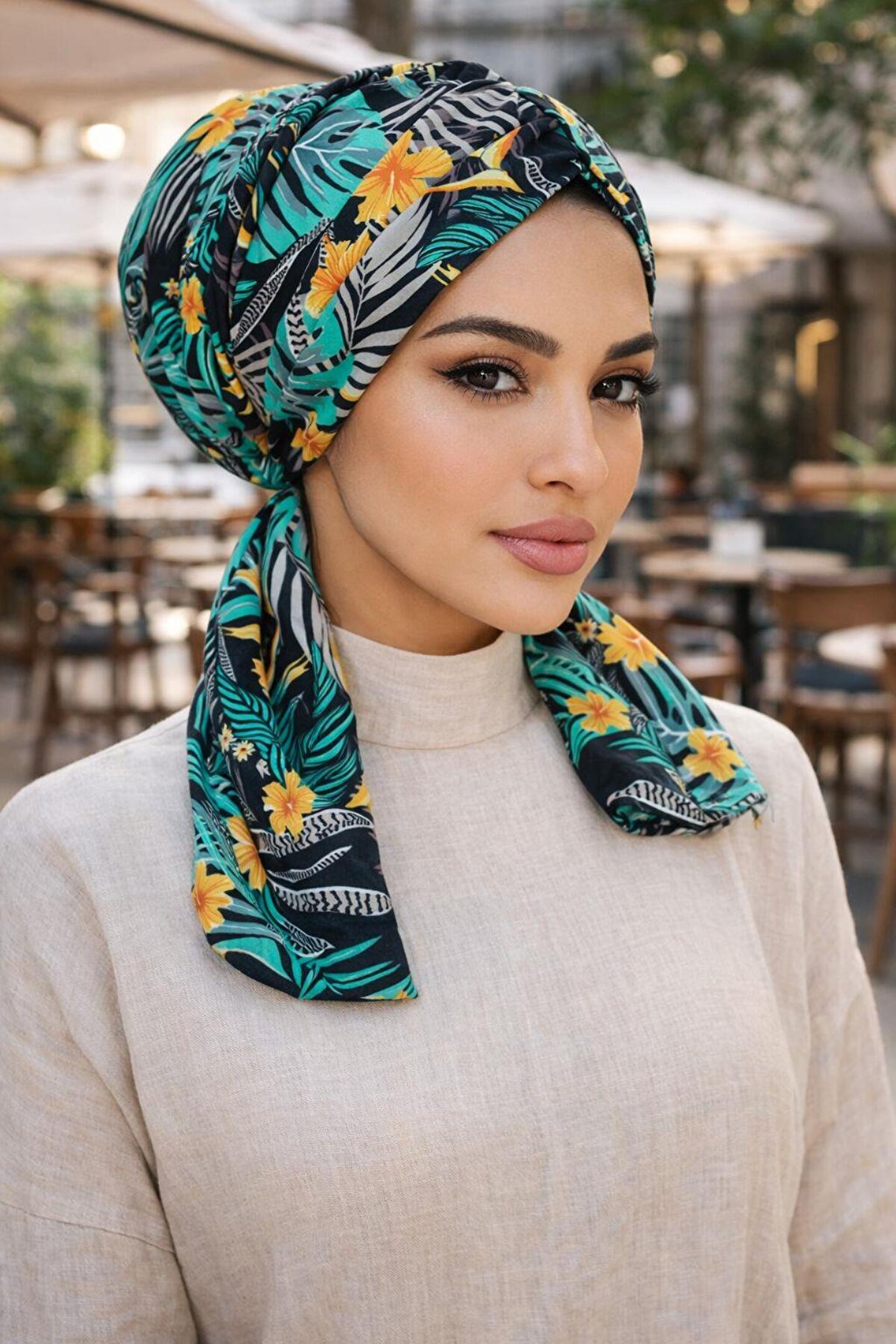Aişe tesettür Yeşil Çiçek Desen Büzgülü Eşarp Bone