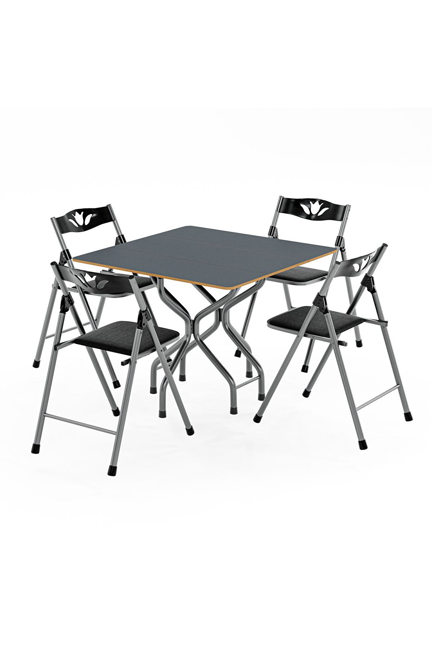 Birinci Kalite %100 Türk Malı; Highglos MDF Malzeme; 1 Adet 90x90 Masa 4 Adet Sandalye Masa Yan Kanatları Katlanır Özelliktedir.; Dar Alanlarda Masanın Bir Kanadı Katlayarakda Kullanabilirsiniz.; Isterseniz 2 kanadınıda katlayabilirsiniz.; Ayrıca tüm sandalyelerde katlanabilir özelliğe sahip olup kullandıktan sonra katlayarak masanın ortasındaki boşluğa yerleştirebilirsiniz.; Sandalyeler, Mutfak Balkon Salon Gibi iç Mekanlarda Kullanılmak İçin Tasarlanmış Olup Şık Görünümü Sayesinde Bulunduğu Ortama Ayrı Bir Güzellik Katacaktır.; Sandalyelerin Sırt ve Mafsalları Plastik Ozellikte Olup Estetiktir.; Sandalyelerin Oturum yerleri Suni deriden imal edilmiştir.; Yenilenmiş Gövde Demir Aksamı En Az 1 ml. Kalınlıktadır.; Gövde Gri renkli Fırın Boya ile Boyanmıştır.; Ürünün Açık Ölçüleri:; 90x90 cm genişlik; 70 cm yükseklik; Ürünün Kapalı Ölçüleri:; 39 cm Genişlik; 90 cm Uzunluk; 70 cm Yükseklik; Ürün Demonte Olarak Gönderim Yapılacaktır.;
