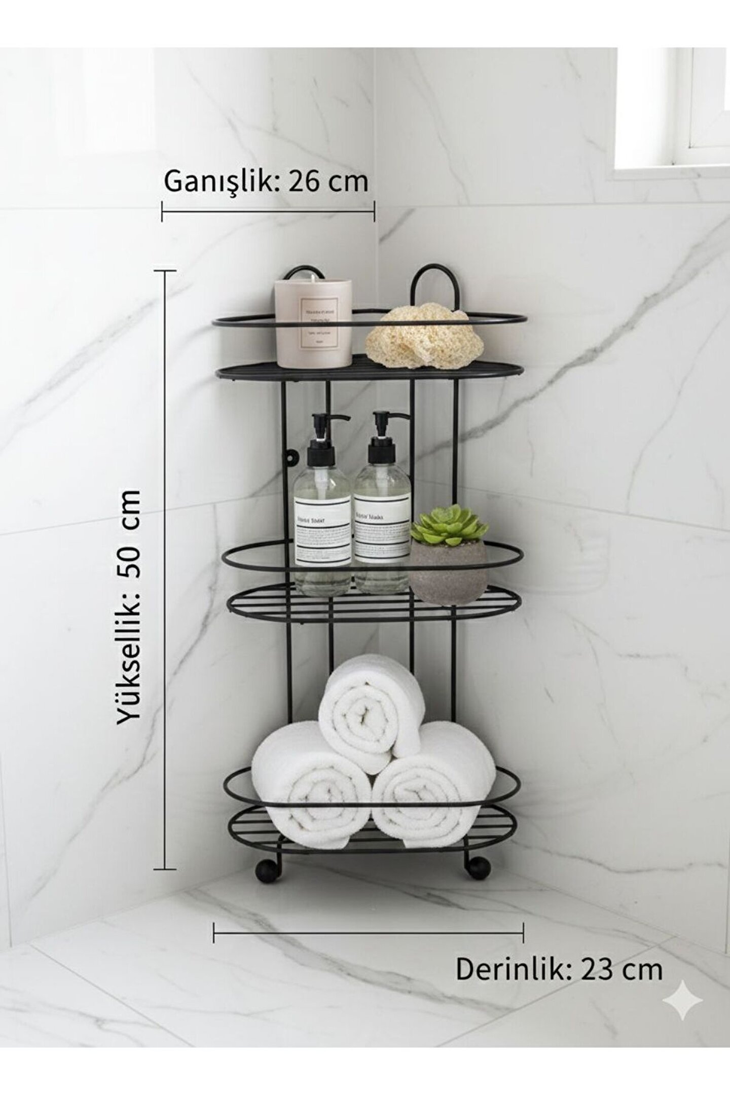 Banyonuzda Yer Açın: Şık ve Dayanıklı 3 Katlı Köşe Düzenleyici Banyonuzdaki dağınıklığa son verecek, modern tasarımıyla dekorasyonunuzu tamamlayacak 3 Katlı Köşelik şimdi tam set olarak sizlerle! İster duş içerisinde şampuanlık olarak, ister banyo köşesinde düzenleyici olarak kullanın.; Üne Çıkan Özellikler: * İdeal Boyutlar: 50 cm yüksekliği ve geniş raf hacmiyle en büyük şampuan şişelerini bile rahatlıkla taşır.; * Eksiksiz Paket: Ürünle birlikte gönderilen dübel ve vida seti sayesinde ekstra malzeme aramanıza gerek kalmadan hemen montajını yapabilirsiniz.; * Paslanmaya Karşı Dirençli: Statik siyah boya kaplaması, nemli banyo ortamlarında uzun ömürlü kullanım sağlar.; * Kolay Temizlik: Izgaralı raflar su tutmaz, kireç ve leke oluşumunu minimuma indirir.; Teknik Detaylar: * Yükseklik: 50 cm * Genişlik: 26 cm * Derinlik: 23 cm * Renk: Mat Siyah * Paket İçeriği: 1 adet 3 Katlı Metal Köşelik, 1 Takım Montaj Vidası ve Dübeli 1 takım yapışkanı