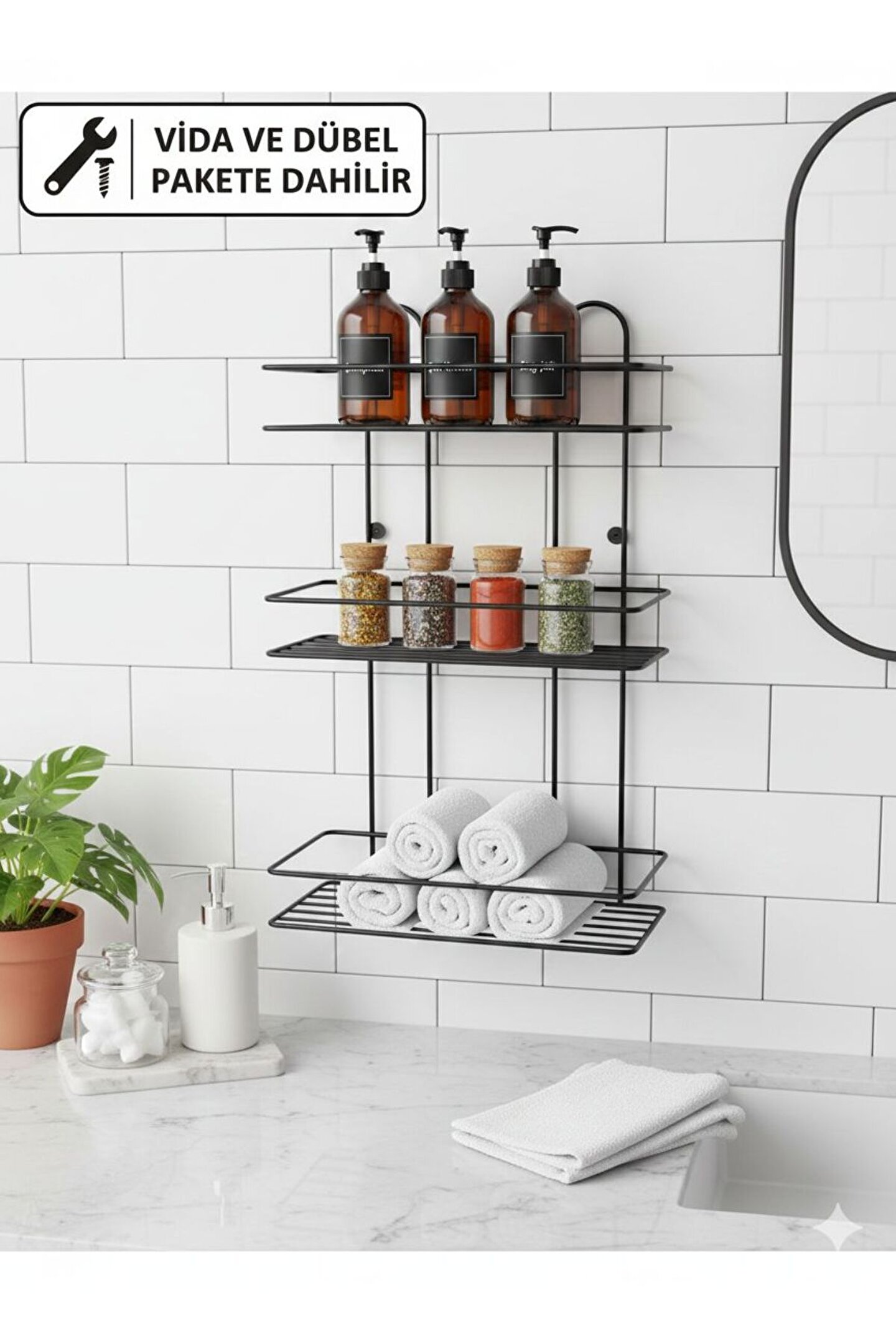 Evinizin Her Köşesine Düzen ve Şıklık Getirin! Minimalist tasarımı ve dayanıklı metal yapısıyla öne çıkan bu 3 katlı raf ünitesi, hem banyonuzda hem de mutfağınızda alan tasarrufu sağlar.; Mat siyah elektrostatik boyası sayesinde paslanmaya karşı dirençlidir ve uzun ömürlü kullanım sunar.; Ürün Özellikleri: * Malzeme: Yüksek kaliteli profil metal (Paslanmaya dayanıklı fırın boya).; * Tasarım: Modern endüstriyel çizgilerle her türlü dekorasyona uyum sağlar.; * Kullanım Alanı: Banyo (şampuanlık, havluluk), Mutfak (baharatlık, yağlık) veya Antre (anahtarlık, dekoratif objeler).; * Montaj: Arka kısmında yer alan iki adet montaj deliği sayesinde duvara kolayca sabitlenebilir.; Teknik Ölçüler: * Yükseklik (Boy): 50 cm * Genişlik (En): 29 cm * Derinlik: 11 cm * Raf Sayısı: 3 Katlı İster Vidalı İster Yapışkanlı Kullanabilirsiniz.; * Delme İşlemine Son: Duvarlarınızı delmeden, çivi kullanmadan saniyeler içinde montaj yapmanızı sağlar.; * Yüksek Taşıma Kapasitesi: Özel yapışkan yüzeyi sayesinde mutfak gereçleri, banyo aksesuarları ve dekoratif eşyalar için ekstra dayanıklıdır.; * Şeffaf ve Estetik Tasarım: Şeffaf yapısı sayesinde uygulandığı yüzeyde görüntü kirliliği yaratmaz, her dekorasyona uyum sağlar.; * Suya ve Neme Dayanıklı: Banyo ve mutfak gibi nemli alanlarda güvenle kullanılabilir, yapışkanlığını yitirmez.; * Çok Yönlü Kullanım: Fayans, cam, metal, ahşap ve PVC gibi pürüzsüz tüm yüzeylere mükemmel tutunur.; Ürün İçerisinde 2 adet yapışkanı 2 adet vidası 2 adet dübeli beraber gelmektedir.