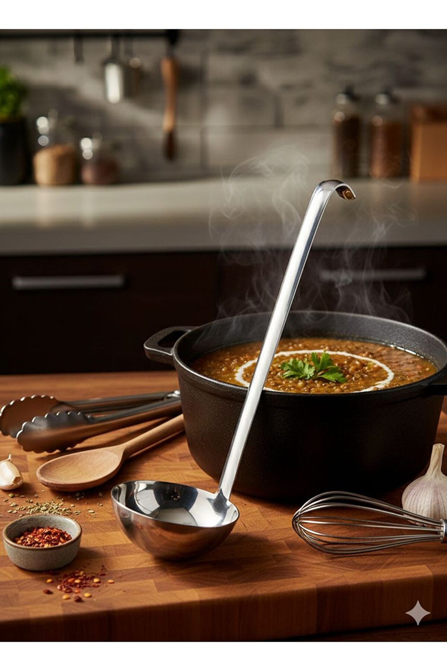 Mutfakta Profesyonel Dokunuş: Paslanmaz Çelik Askılı Kepçe Hem ev mutfaklarında hem de profesyonel işletmelerde uzun yıllar güvenle kullanabileceğiniz bu kepçe, dayanıklılığı ve ergonomik tasarımıyla öne çıkıyor.; Yüksek kaliteli paslanmaz çelikten üretilmiştir, korozyona karşı dirençlidir ve gıda ile temasa %100 uygundur.; Öne Çıkan Özellikler: * Yüksek Malzeme Kalitesi: Kararma yapmayan, parlaklığını koruyan paslanmaz çelik yüzey.; * Ergonomik Tasarım: Uzun sap yapısı sayesinde derin tencerelerde elinizi yakmadan servis yapmanızı sağlar.; * Pratik Askı Çengeli: Sap kısmındaki özel kavis sayesinde tencere kenarına asılabilir veya mutfak askılarına kolayca yerleştirilebilir.; Tencerenin içine düşme sorununu ortadan kaldırır.; * Kolay Temizlik: Bulaşık makinesinde yıkanabilir, hijyeniktir.; * Çok Amaçlı Kullanım: Çorba, sulu yemek, sos ve içecek servisi için idealdir.; UZUNLUK : 40 CM EN : 10 CM