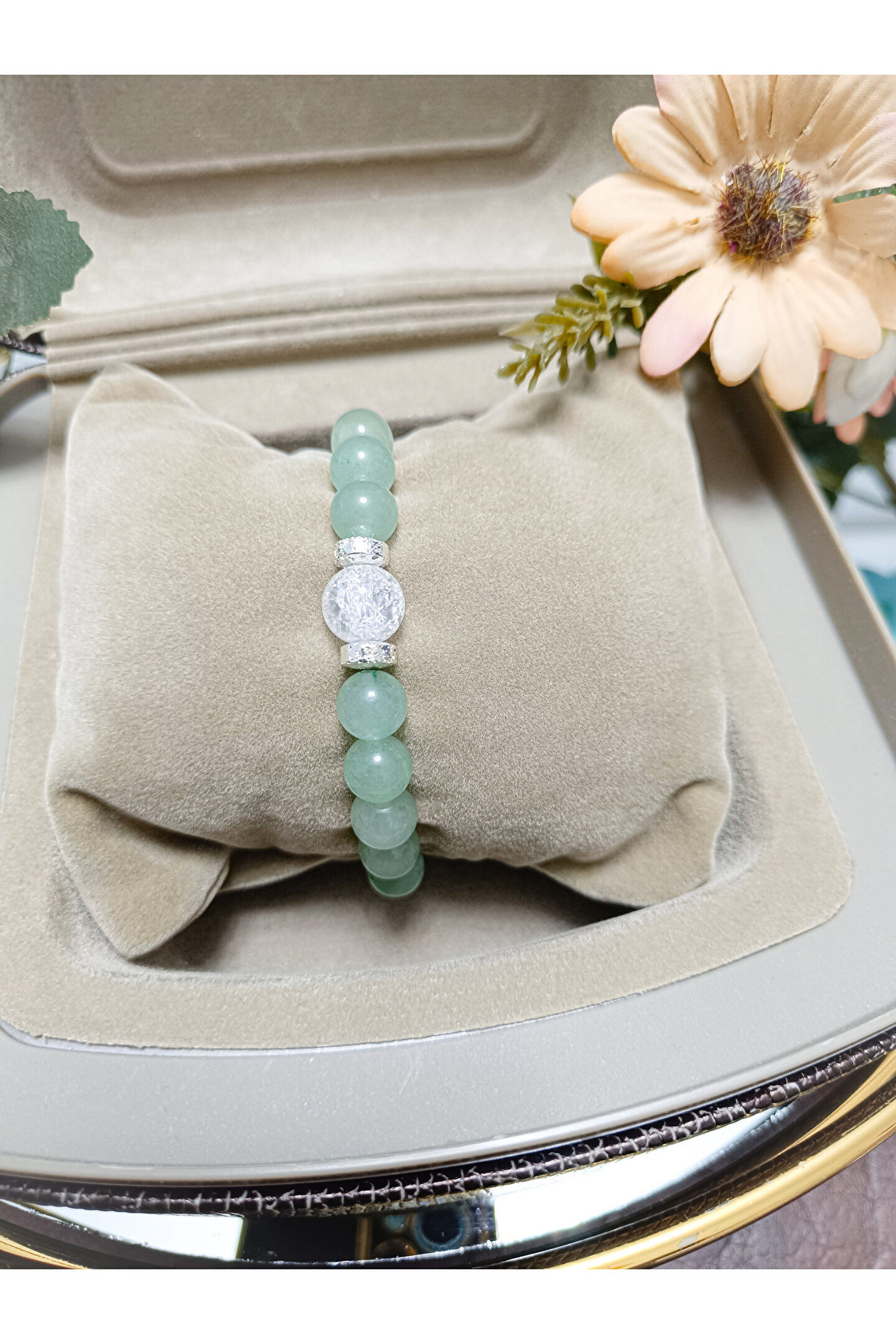 Doğal taş bileklik, şıklığınızı tamamlayacak zarif bir aksesuardır; Aventurin ve necef taşı gibi doğal taşların eşsiz renk ve desenleriyle göz alıcı bir görünüm sunar; Her bileklik, benzersiz ve otantik bir stil ifade ederken, doğanın güzelliklerini bileğinizde taşımanızı sağlar; Doğal taş kullanımı sayesinde hem dayanıklılık hem de estetik bir dokunuş sunar;