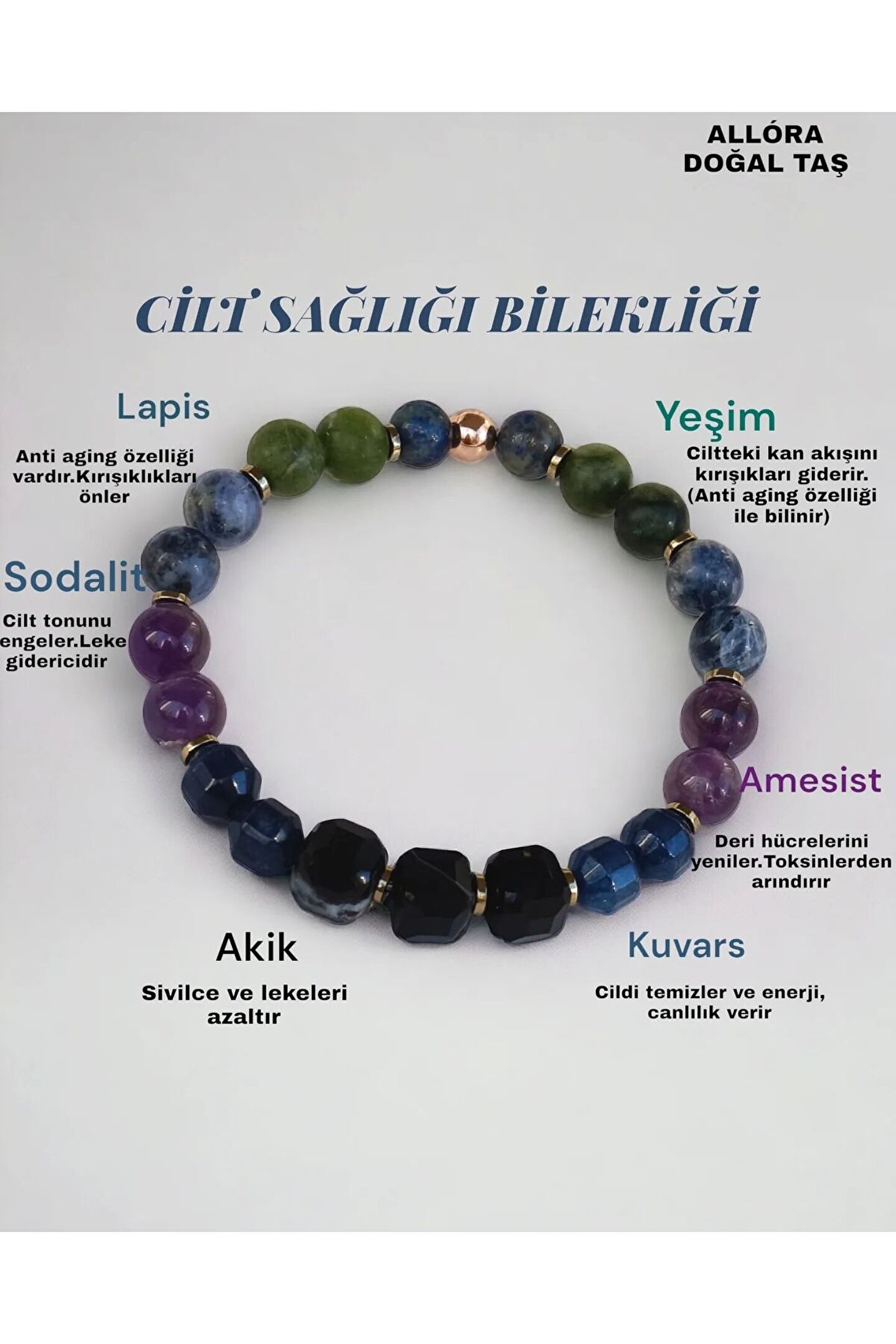 Yeşim, Lapis Lazuli, Amethyst, Akik ve Quartz gibi değerli taşlarla süslenmiş olup, benzersiz bir güzellik sunar.; Sağlıklı yaşam tarzını benimseyenler için ideal bir seçim olan bu bileklikler, doğanın sunduğu güzellikleri parmak uçlarınıza taşır.; Hem günlük kullanım hem de özel günlerde tercih edebileceğiniz bu bileklikler, hem kendinize hem de sevdiklerinize hediye olarak da düşünebilirsiniz.;