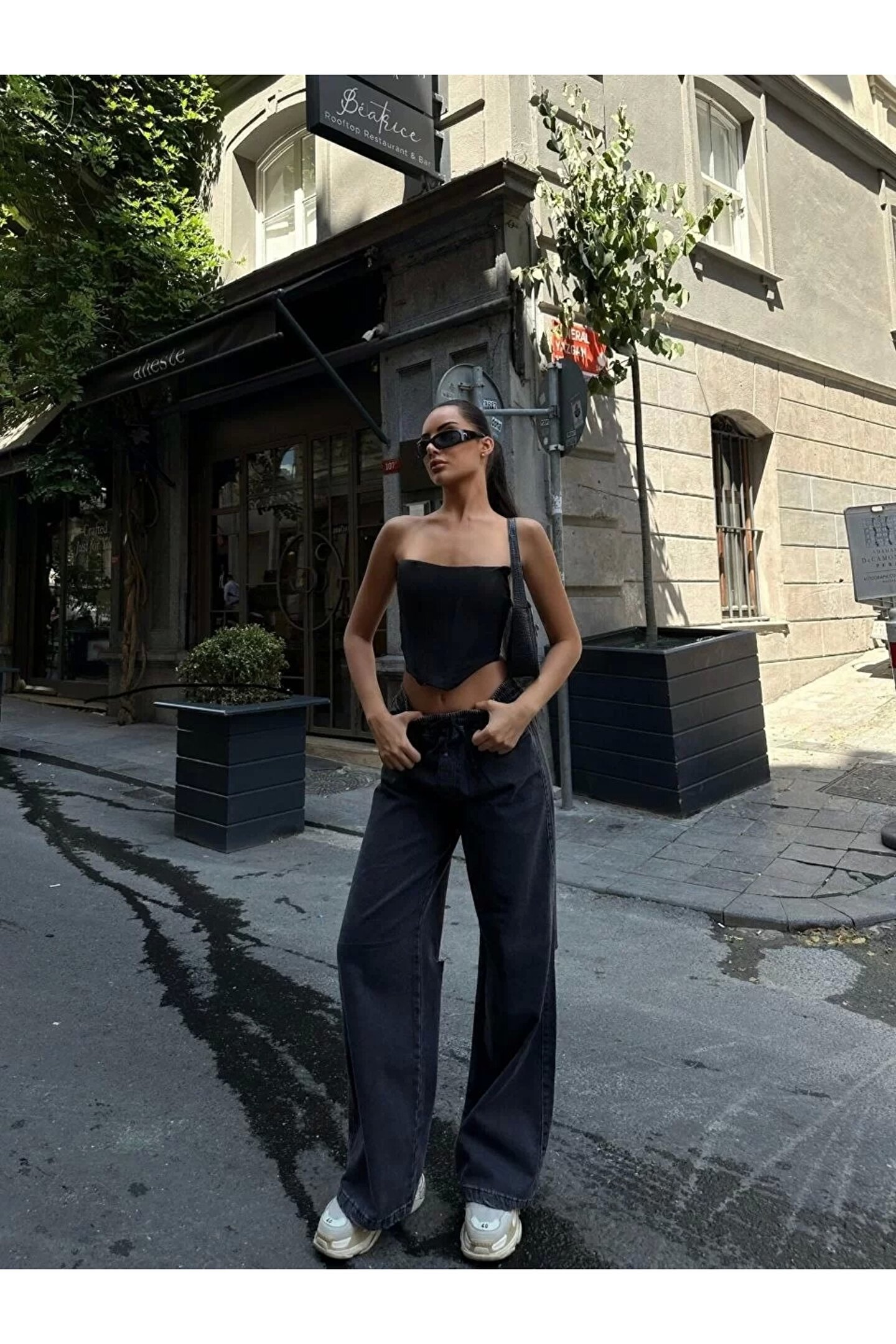 ALPACO Kadın Arkadan Yırtmaçlı Jeans Kot Palazzo Pantolon - Siyah
