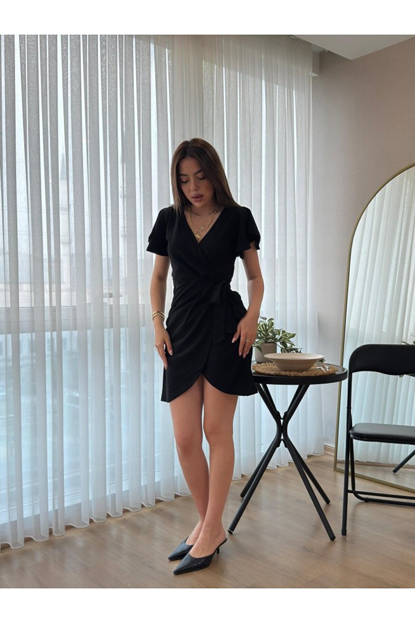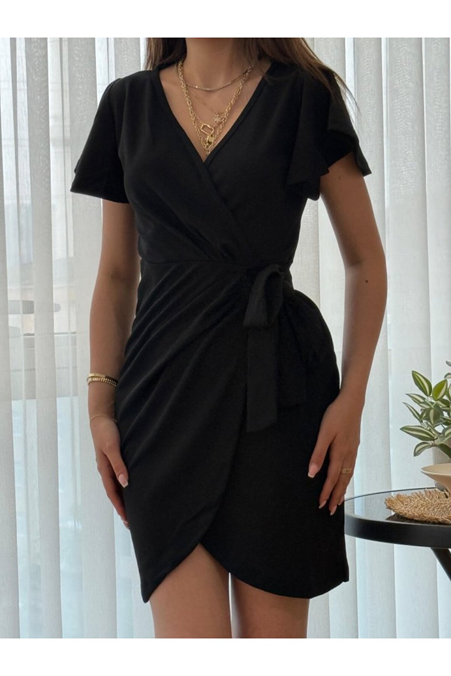 Kadın Kısa Kollu Kruvaze Yakalı Belden Bağlamalı Ithal Krep Elbise