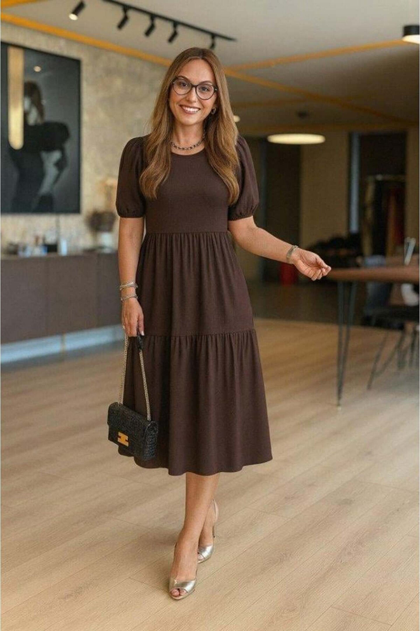 ALPACO Kadın Kısa Kollu Yakası Açık Katlı Bürümcük Balon Elbise