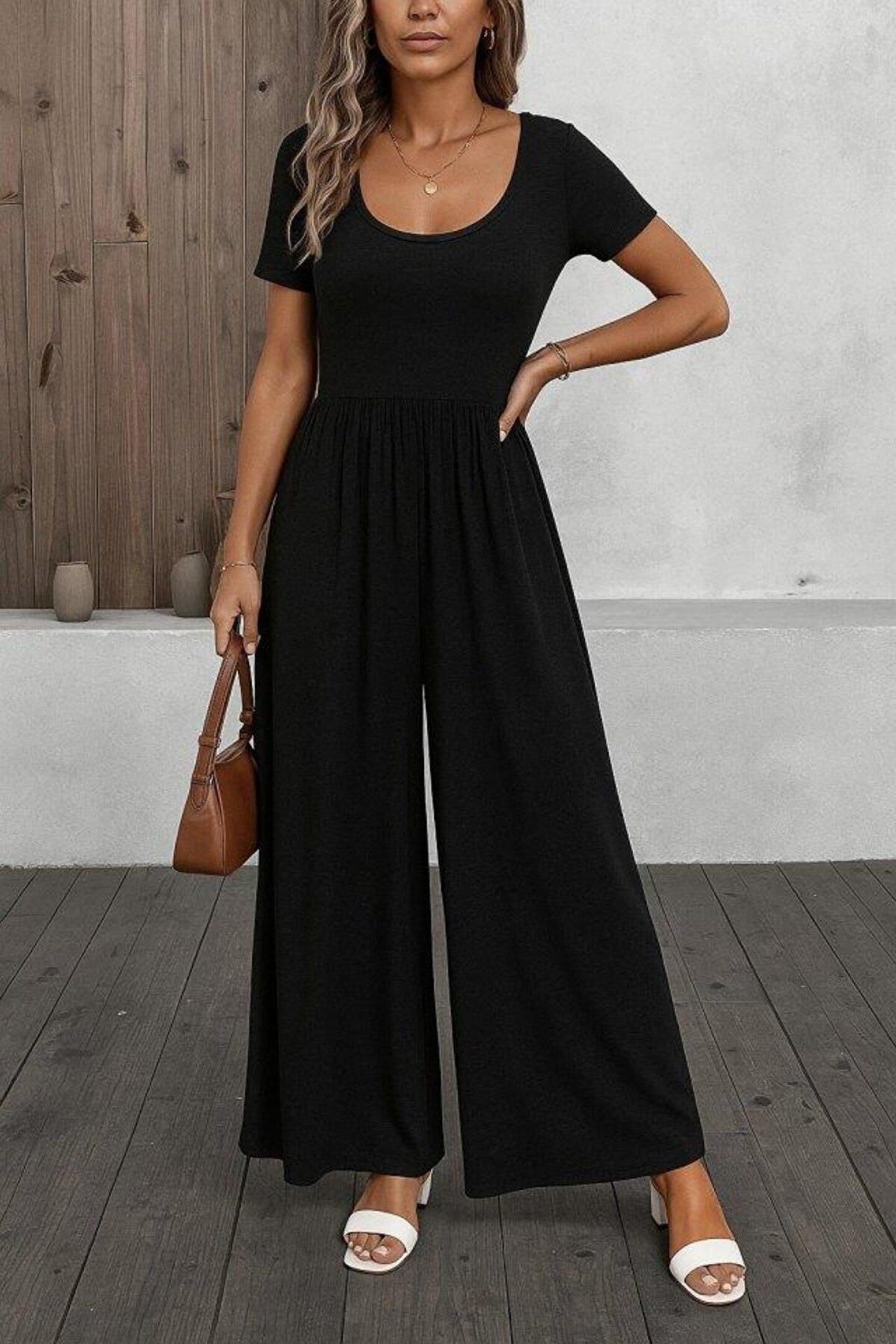 ALPACO Kadın Kısa Kollu Yuvarlak Yaka Geniş Paçalı Bürümcük Tulum
