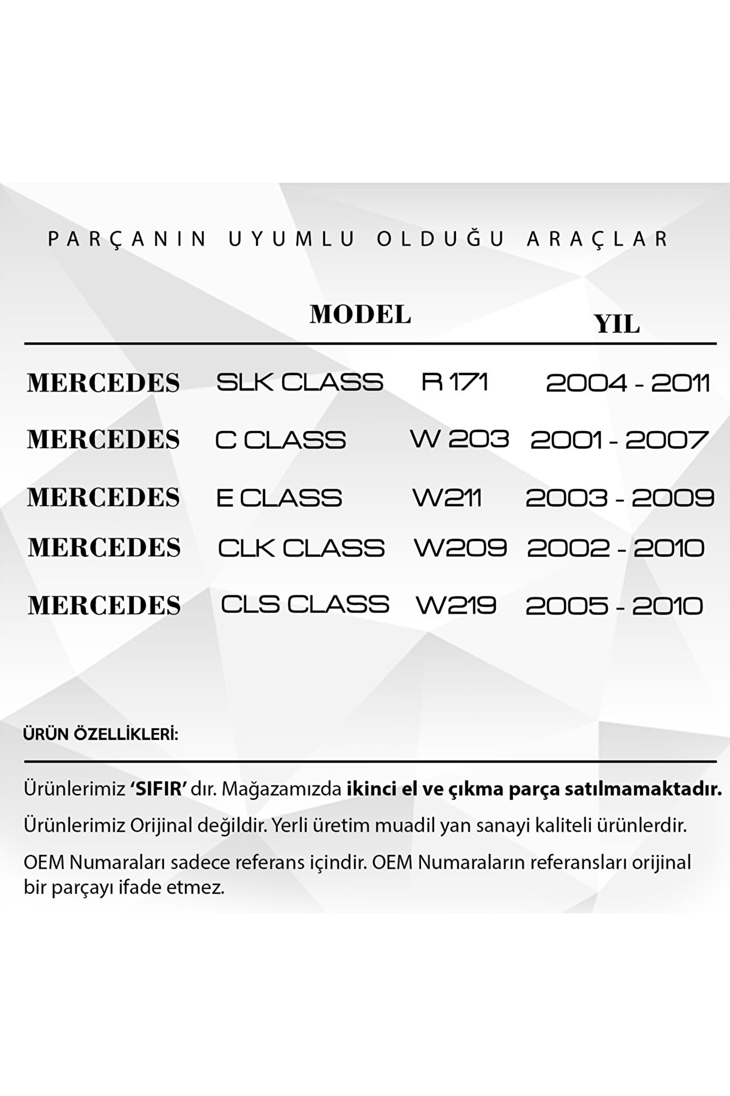 Mercedes W203.W211.W209 için Bagaj Dişlisi.; Araba Bagaj Dişlisi, aracınızın bagajını düzenli ve kullanışlı hale getiren bir üründür.; Yüksek kapasiteli ve dayanıklı tasarımı sayesinde, araç bagajınızda fazladan yer elde edin.; Araç içi düzeninizi korurken aynı zamanda bagajınızdaki eşyaların güvenliğini de sağlar.; Kolay kurulum özelliği ile zamanınızdan tasarruf edin.; Bu ürün, çizilmeye karşı dirençli ve ağırlığı kolaylıkla taşıyabilecek kapasitededir.; Araç bagaj dişlisi, yolculuklarınızı daha konforlu ve düzenli hale getirecek bir üründür.; Hem uzun yolculuklarda hem de günlük kullanımda idealdir.; Ürün Kodu: DLR2252