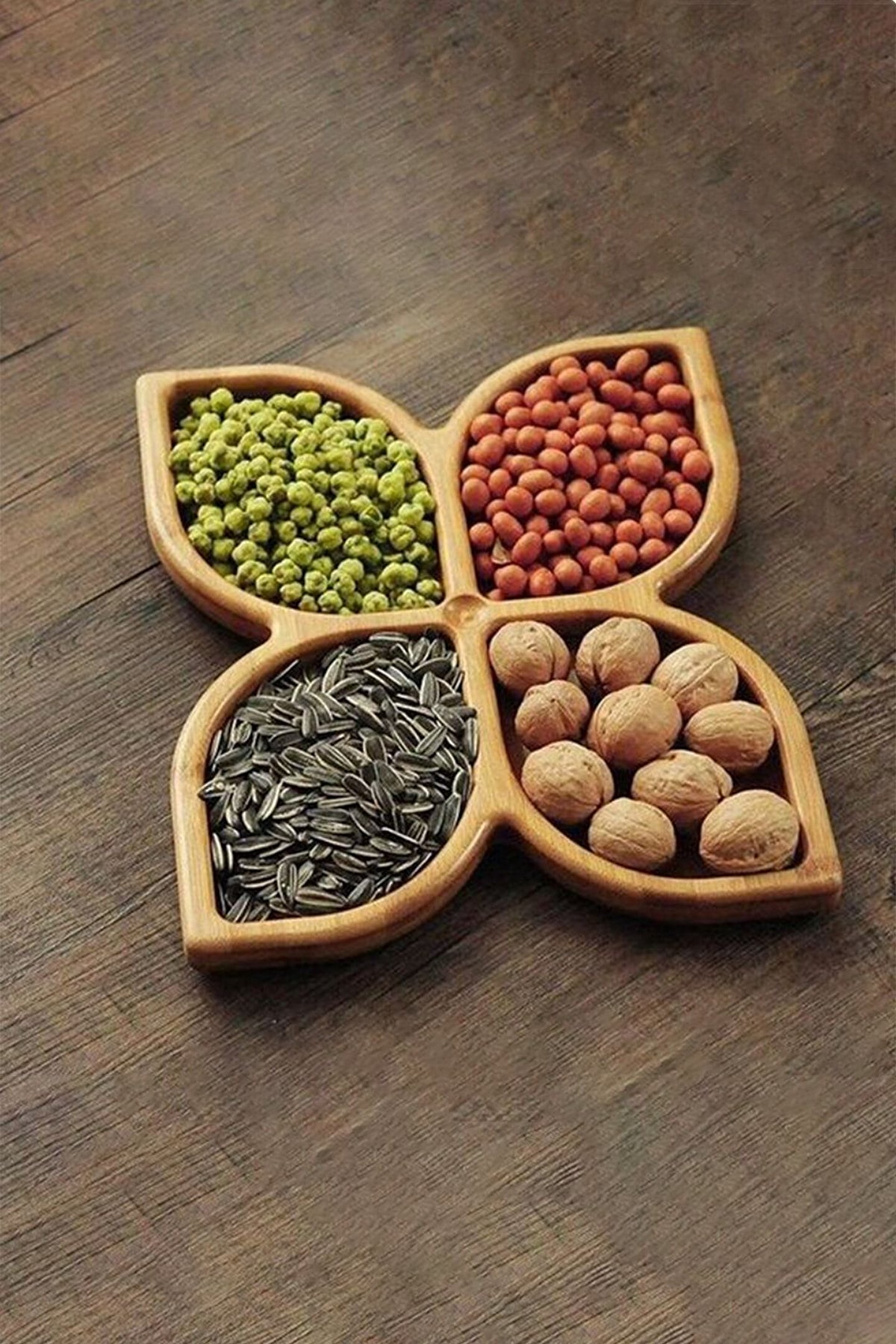 Ahşap Sunumluk Çerezlik Çiçek Şekli Servis Tabağı Tepsisi 4 Bölmeli Kahvaltılık 24 Cm Çam Bambu