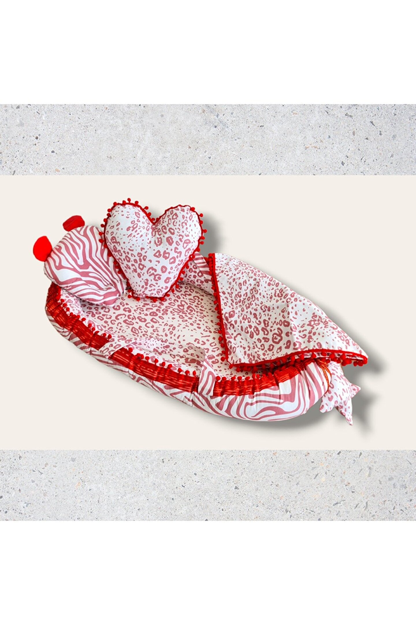 Kırmızı pomponlu Babynest Yatak ve baş yastığı %100 pamuklu kumaştan üretilmiştir, Kenarları ezilmez ve toplanmaz silikonlu 1. ; sınıf boncuk elyafla doldurulmuştur. ; Ortopedik kulaklı yastık düz kafa yastığı Uç kısmında bulunan yıldızlı ipler ile ürün boyu istediğiniz genişlikte ayarlanabilir. ; Bir buçuk yaşına kadar kullanılabilir. ; Dıştan dışa 100x65 cm dir. ; İç ölçüleri 75x35 cm dir. ; Bebeklerinizi, gittiğiniz her yerde rahatlıkla kendi temiz ortamında ki gibi uyutabileceksiniz. ; Pike battaniye 80 x 80 cm % 100 pamuklu kumaştan üretilmiştir terleme ve koku yapmaz, Paket içerisin de babynest, düz kafa yastığı, dekoratif kalp yastık ve pike bulunmaktadır. ; Yerli üretimdir...;