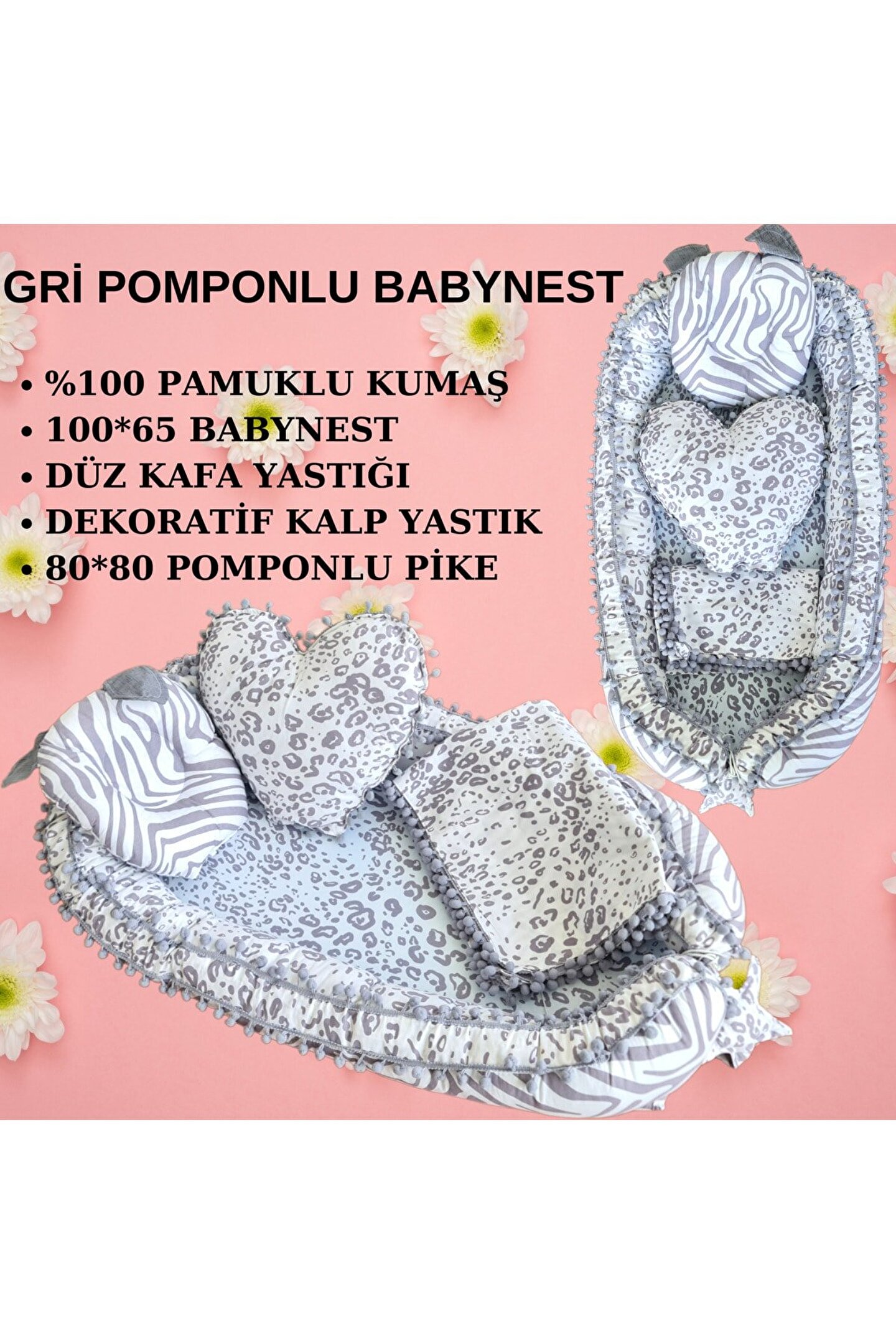 Kırmızı pomponlu Babynest Yatak ve baş yastığı %100 pamuklu kumaştan üretilmiştir, Kenarları ezilmez ve toplanmaz silikonlu 1. ; sınıf boncuk elyafla doldurulmuştur. ; Ortopedik kulaklı yastık düz kafa yastığı Uç kısmında bulunan yıldızlı ipler ile ürün boyu istediğiniz genişlikte ayarlanabilir. ; Bir buçuk yaşına kadar kullanılabilir. ; Dıştan dışa 100x65 cm dir. ; İç ölçüleri 75x35 cm dir. ; Bebeklerinizi, gittiğiniz her yerde rahatlıkla kendi temiz ortamında ki gibi uyutabileceksiniz. ; Pike battaniye 80 x 80 cm % 100 pamuklu kumaştan üretilmiştir terleme ve koku yapmaz, Paket içerisin de babynest, düz kafa yastığı, dekoratif kalp yastık ve pike bulunmaktadır. ; Yerli üretimdir...;