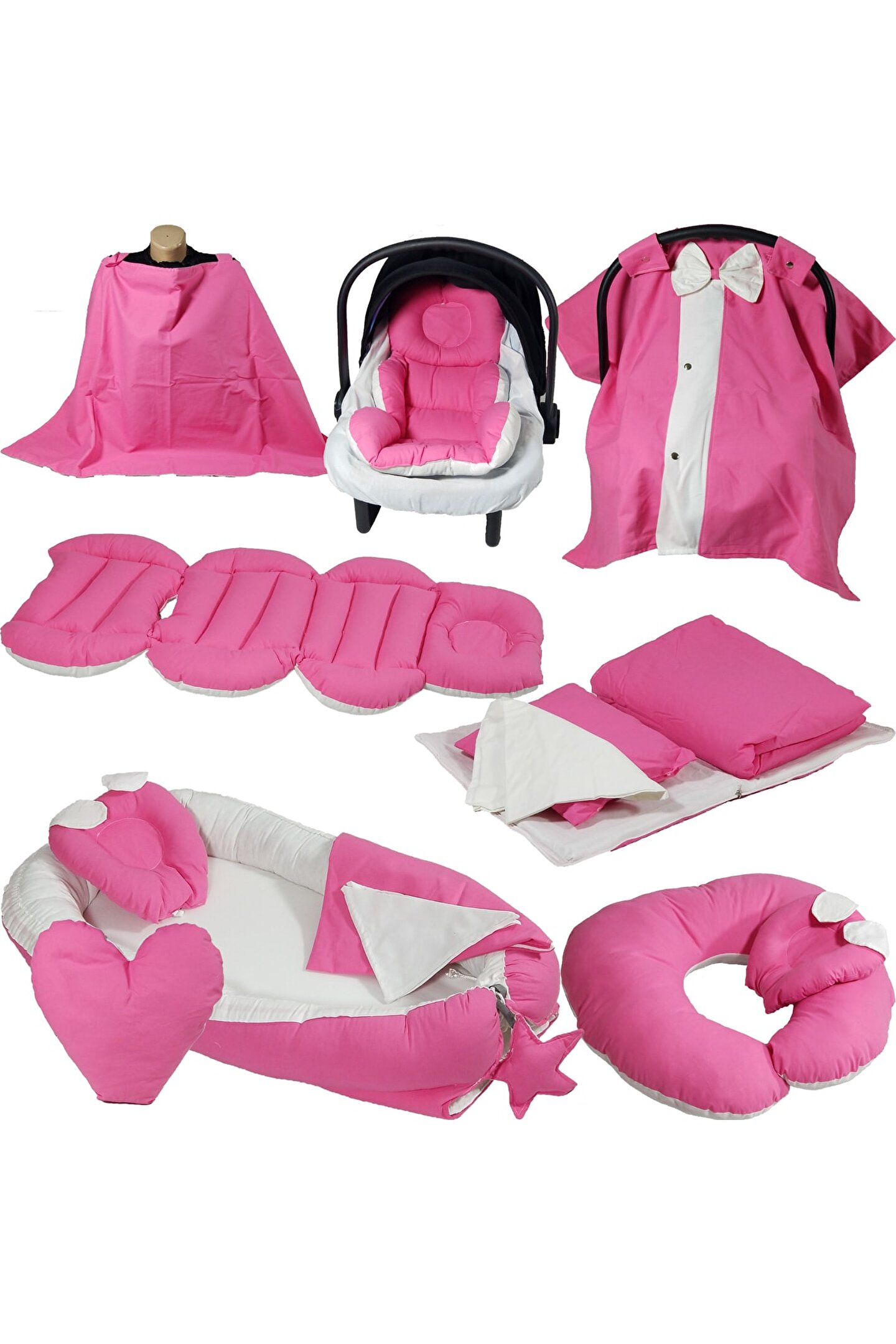 Babynest Puset İçi Set Araba Minderi Emzirme Örtüsü Ve Minderi Beşik İçi Nevresim Takımı 15 li set BRİMİ COLLECTİON 15'li yeni doğan setimiz %100 pamuklu kumaştan üretilmiştir, Kenarları ezilmez ve toplanmaz silikonlu 1. sınıf boncuk elyafla doldurulmuştur. Ortopedik kulaklı yastık düz kafa yastığı, Uç kısmında bulunan yıldızlı ipler ile ürün boyu istediğiniz genişlikte ayarlanabilir. Bir buçuk yaşına kadar kullanılabilir. Dıştan dışa 100x65 cm dir. İç ölçüleri 75x35 cm dir. Bebeklerinizi, gittiğiniz her yerde rahatlıkla kendi temiz ortamında gibi uyutabileceksiniz. Pike battaniye 80 x 80 cm % 100 pamuklu kumaştan üretilmiştir terleme ve koku yapmaz. Paket içerisin de ; düz kafa yastığı ve pike bulunmaktadır. Paket içerisin de ; Babynest, Düz kafa yastığı, pike Puset örtüsü, puset çarşafı, puset minderi, Çocuk araba minderi (araç içi koltuk minderi olarakta kullanılmaktadır), Emzirme örtüsü olarak gönderim yapılmaktadır. Emzirme önlüğü 75*115 cm dir, boyun askısı çıt çıtlıdır ve 3 kademelidir kendi bedeninize göre ayarlayabilirsiniz. Tüm pusetler için uygun ölçüde tasarlandığından gönül rahatlığı ile tercih edilebilir. Bebeğinizi güneşten rüzgardan tozdan korur. Yerli üretimdir... ;