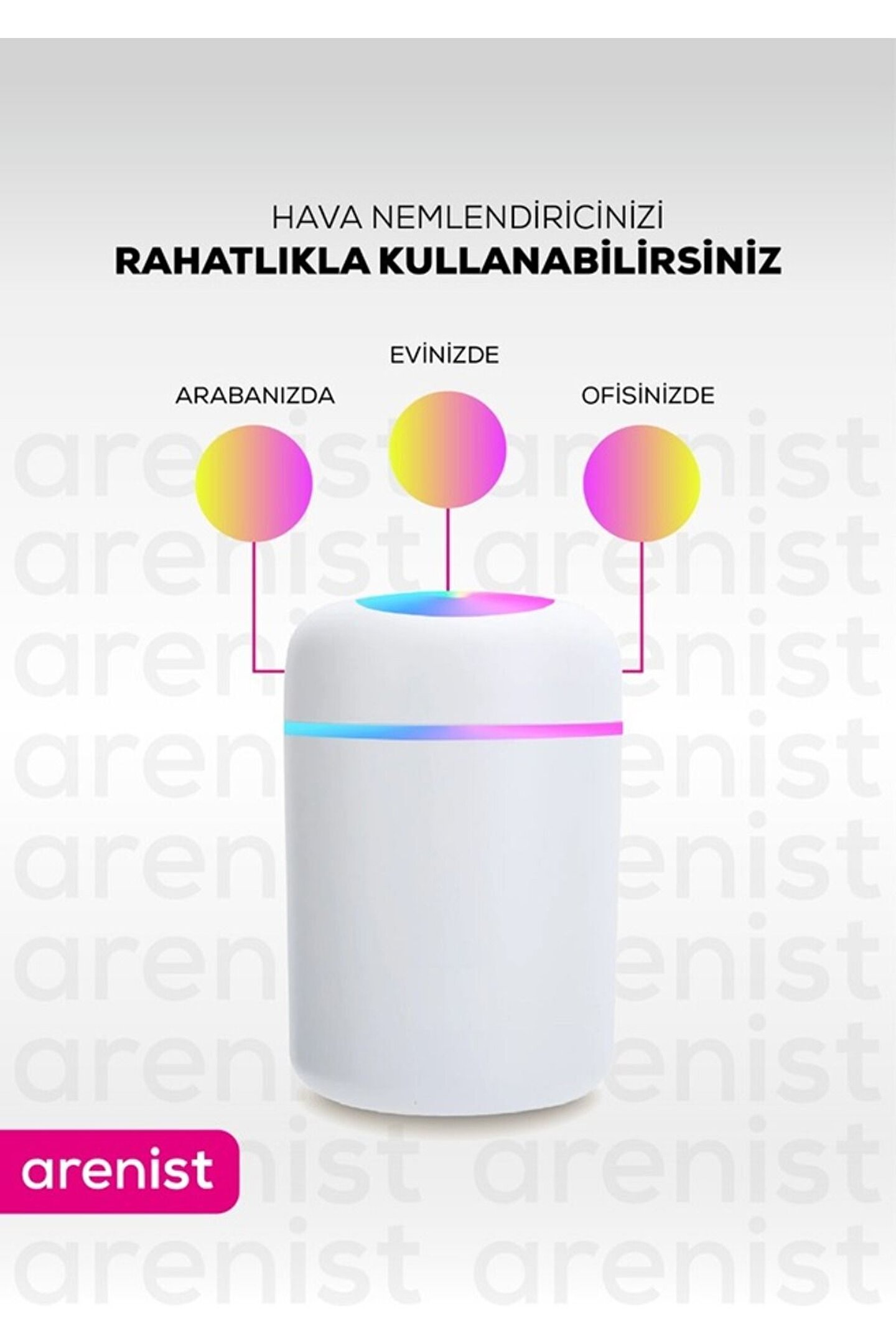 ARENİST 300 Ml Ultrasonik Hava Nemlendirici Buhar Makinesi Ve Aroma Difüzörü 300 ml kapasiteli su tankı,değişen renkli led lambası,ergonomik tasarımıyla evinizin veya arabanızın atmosferini değiştirebilirsiniz. ; Ultrasonik hava nemlendirici özellikleri : Ultrasonik buhar teknolojisi yüksek frekanslı ses dalgalarıyla ,suyun su buharına dönüştürülmesidir.Kapalı alanlarda bulunan nem miktarının ideal ve sağlıklı seviyeye gelmesini sağlamaktadır.Aynı zamanda cilt,burun,boğaz ve dudakların kuruluğunu tedavi etmek için özellikle etkili olabilir.Yüksek kaliteli abs ve silikondan yapılmıştır.Renkli led ışığıyla odanızda gece lambasına dönüşebilir.Gece ışığı ve nemlendiriciyi bir araya getirebilir ve günlük yaşamınızı daha akıllı hale getirir.Odanızın rahatlatıcı tütsü yaymasını sağlamak için tanka oda parfümü veya uçucu yağ ekleyebilirsiniz.(suyun içine damlatarak). ; Ayrıca su veya alkol bazlı dezenfektan koyarak bulunduğunuz ortamın dezenfeksyonunu yapabilirsiniz. ; Led ışık yakmak için açma-Kapatma düğmesine uzun basmanız gerekmektedir. ; Kullanma talimatı: 1- Ürün kapağını çevirerek yukarı kaldırın, 2- Hazneye su doldurun, 3- Usb güç kablosunu takın, 4- Tuşa bir kez dokunarak çalıştırın, 5- Tuşa basılı tuttuğunuz zaman, led ışık yanmaktadır. ; 6- Tuşa ikinci kez dokunduğunuzda, püskürtme modu sürekli püskürtme modundan, aralıklı püskürtme moduna geçmektedir.;