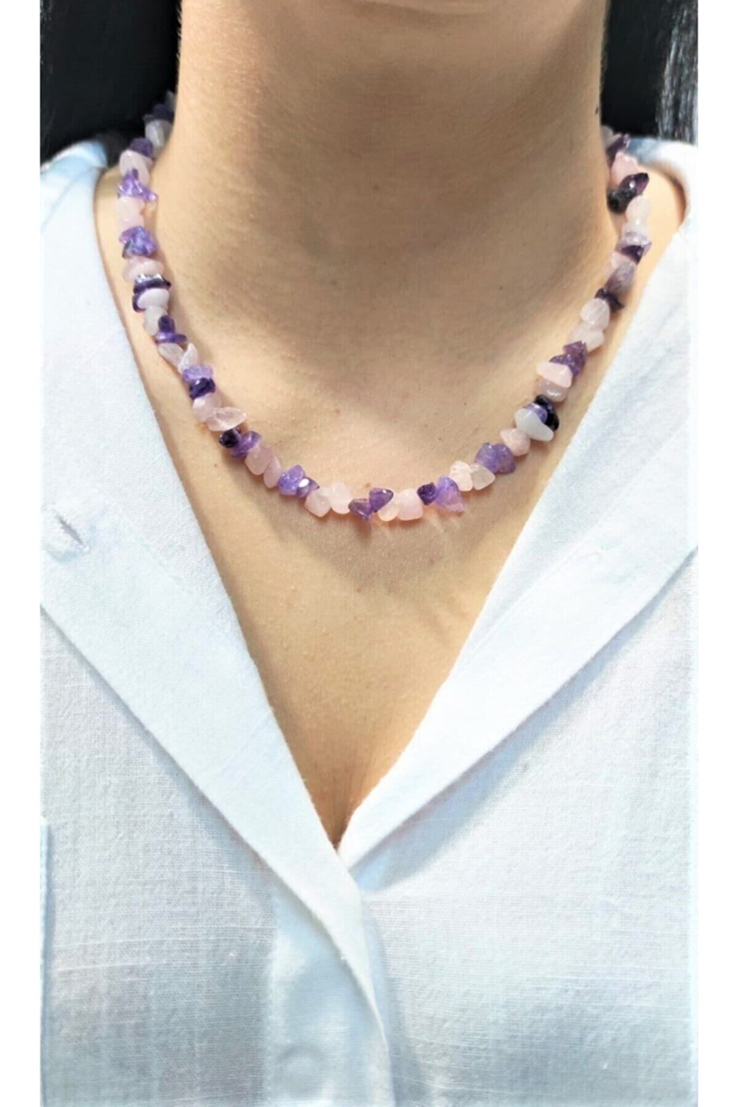 - Doğal taş kullanımı sayesinde her kolye benzersiz ve otantik bir görünüm sunar; - Ametist pembe kuvars kırıktaş, hem şıklığı hem de zarafeti bir arada barındırır; - Taşın doğal dokusu, her kıyafetle uyum sağlayarak stilinizi tamamlar;